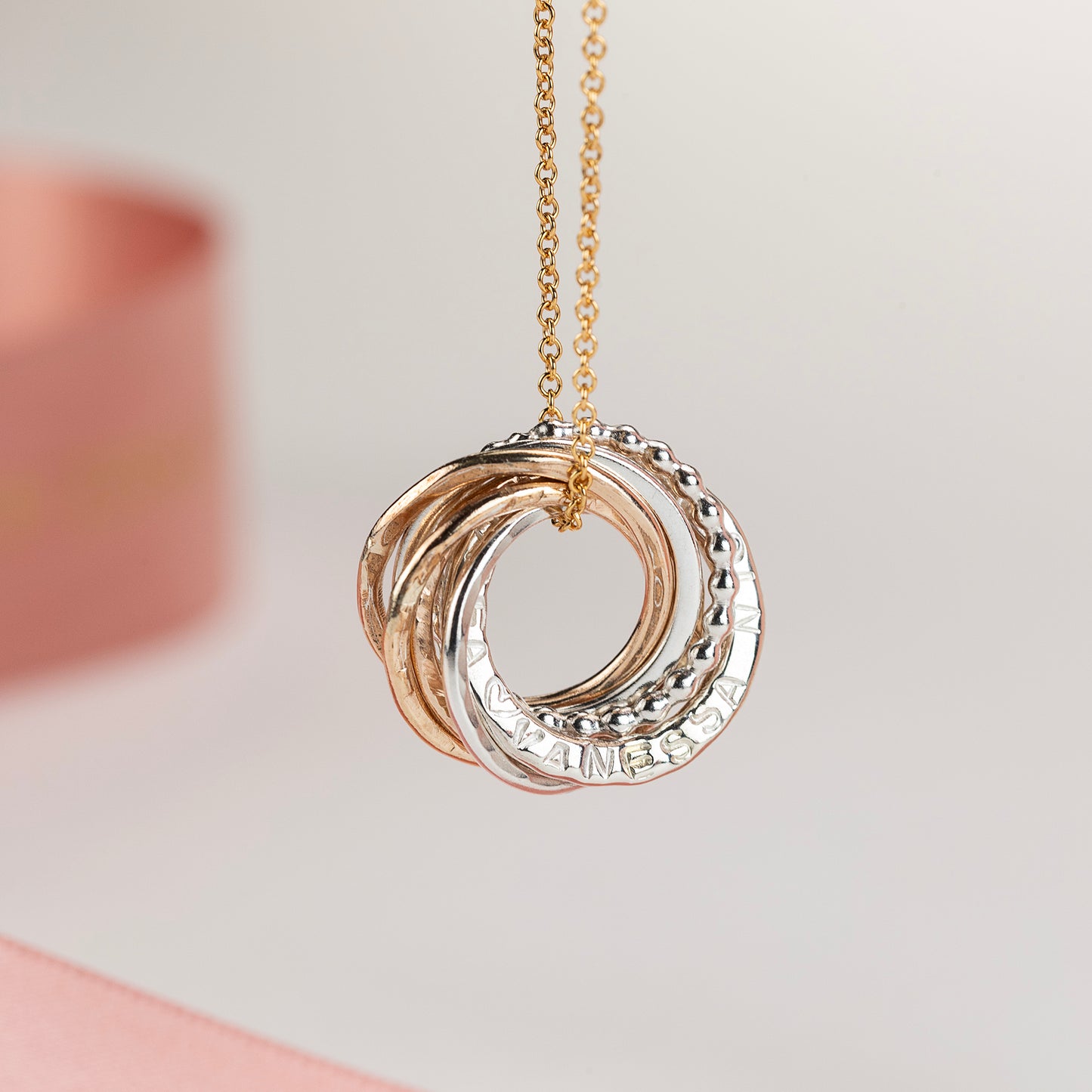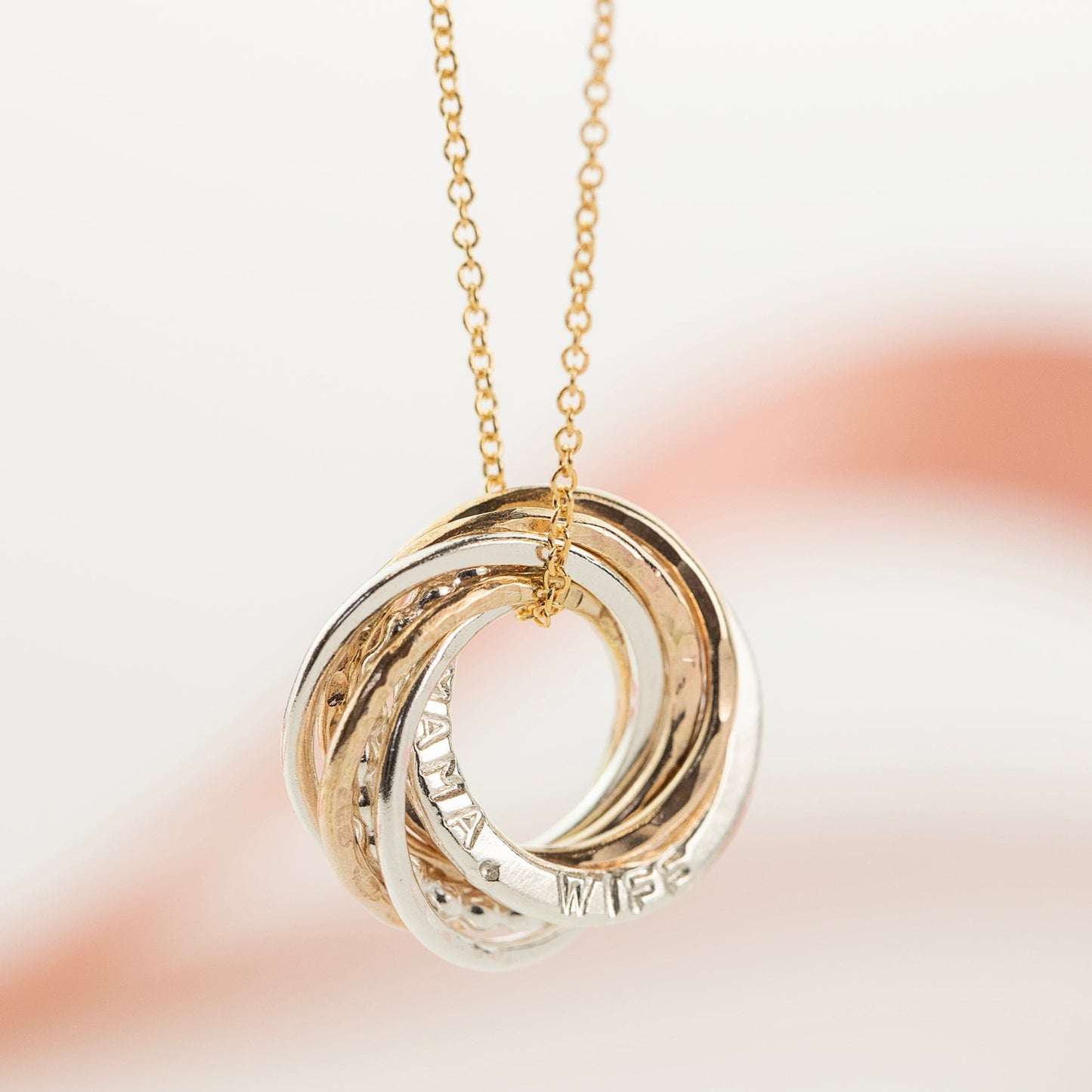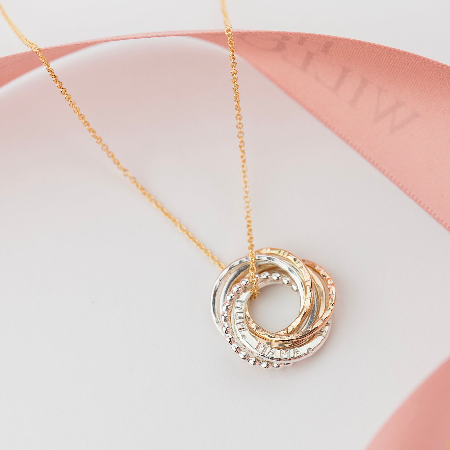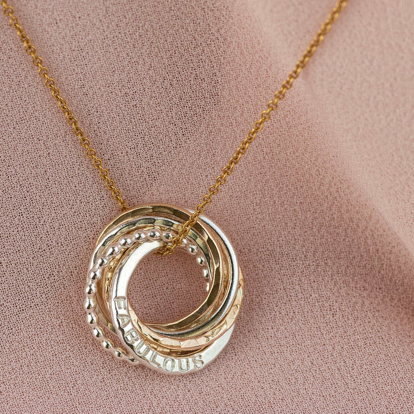 Circles symbolise infinite love, strength, protection and unity. We make her pendant with seven linked circles, one for each decade. One link is hand-stamped with her name, or date or words which are meaningful to her - up to 15 characters. Available symbols include numbers and ♡ . - &
