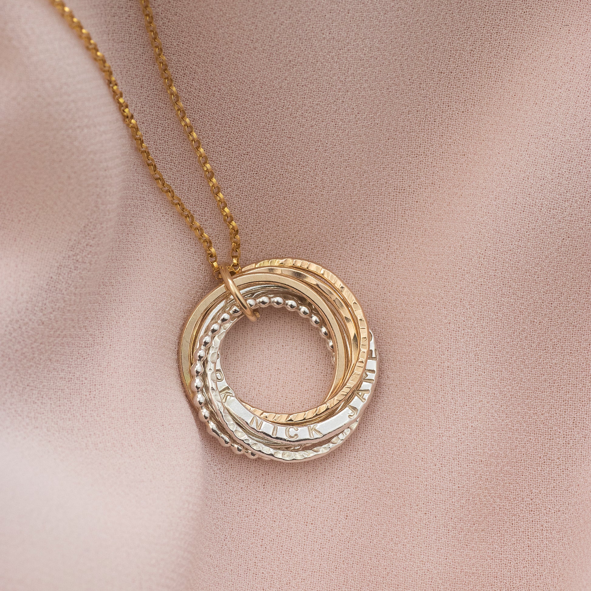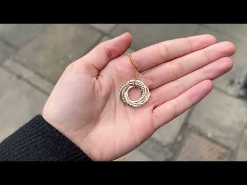 Circles symbolise infinite love, strength, protection and unity. Nine circles are linked to represent her nine decades. One link is hand-stamped with the name, or date or words which are meaningful to her - up to 20 characters.