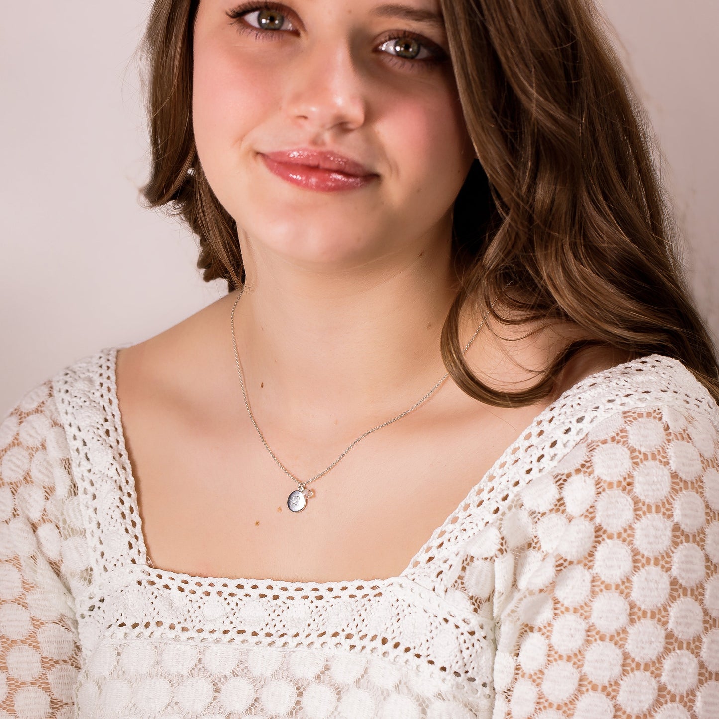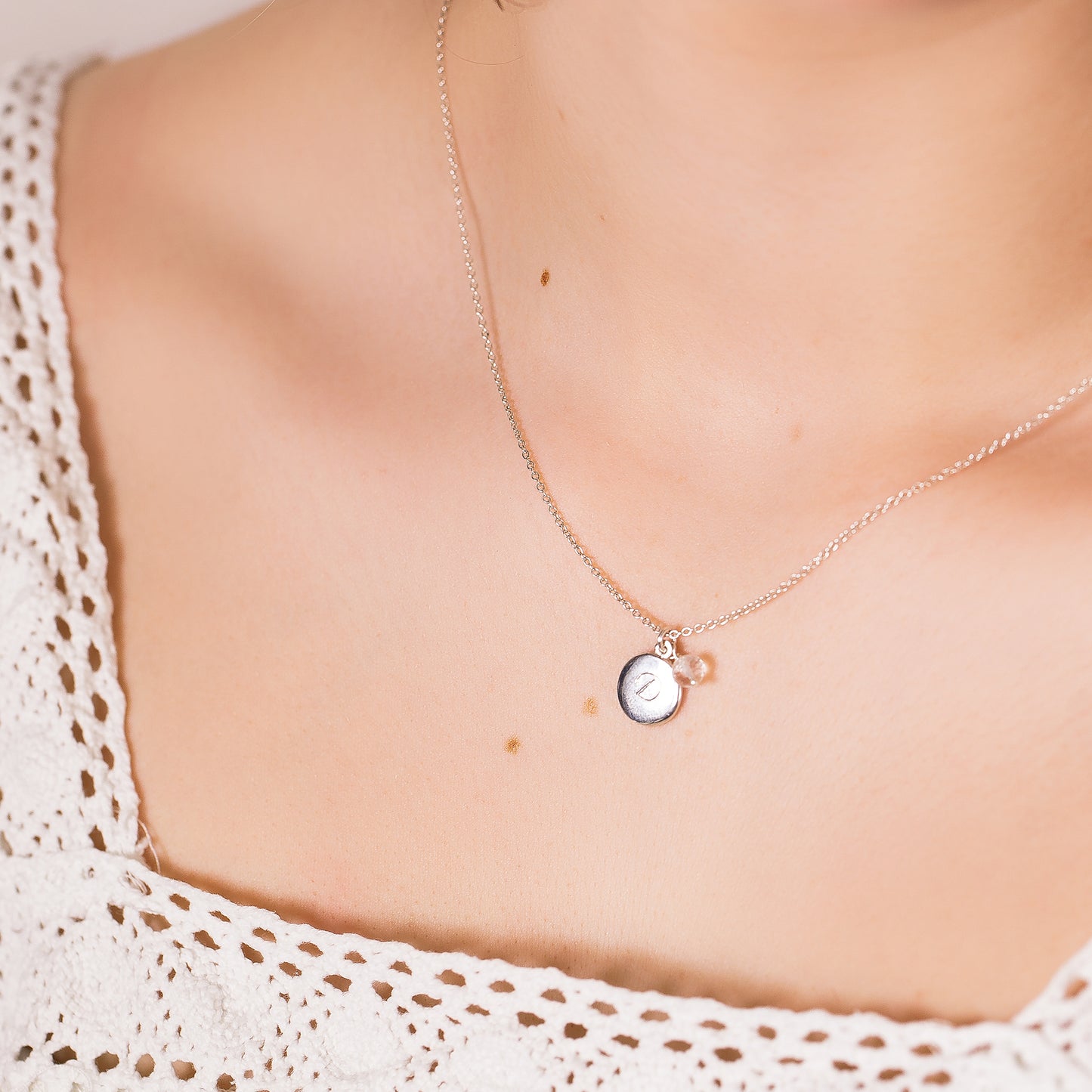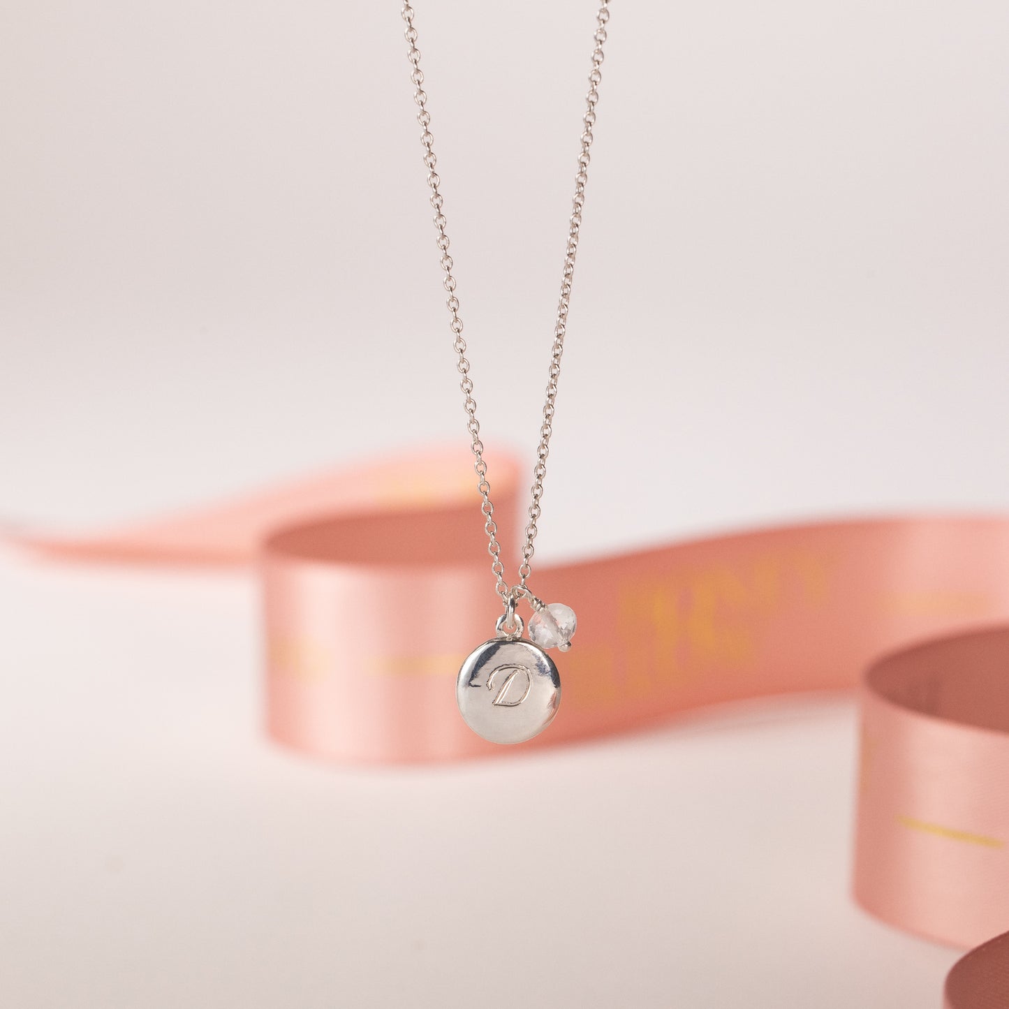 Gift your loved one a dainty sterling silver pendant engraved with her initial, with her birthstone beside it.