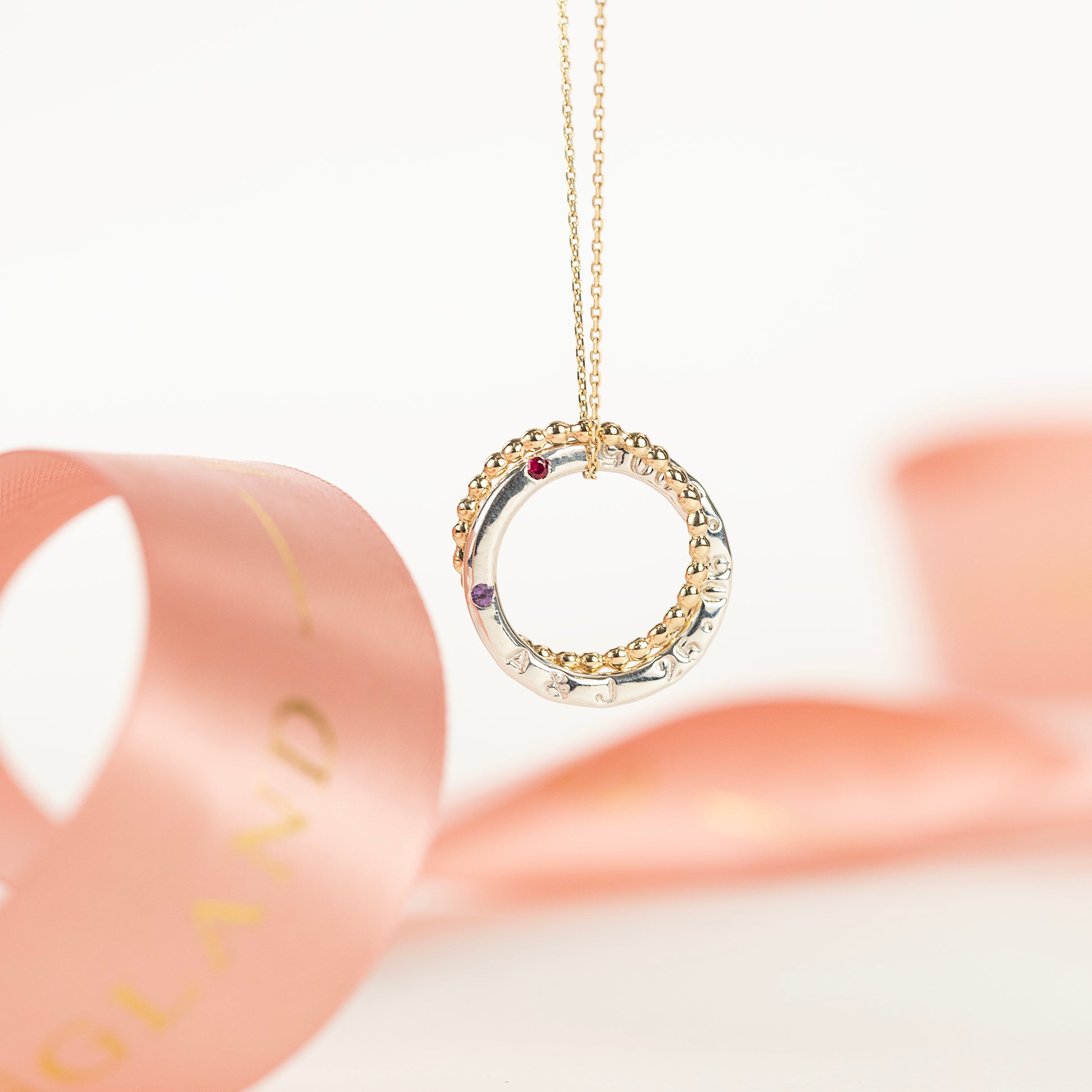 We handcraft her pendant with sterling silver, recycled 9kt gold and a two conflict-free birthstones.