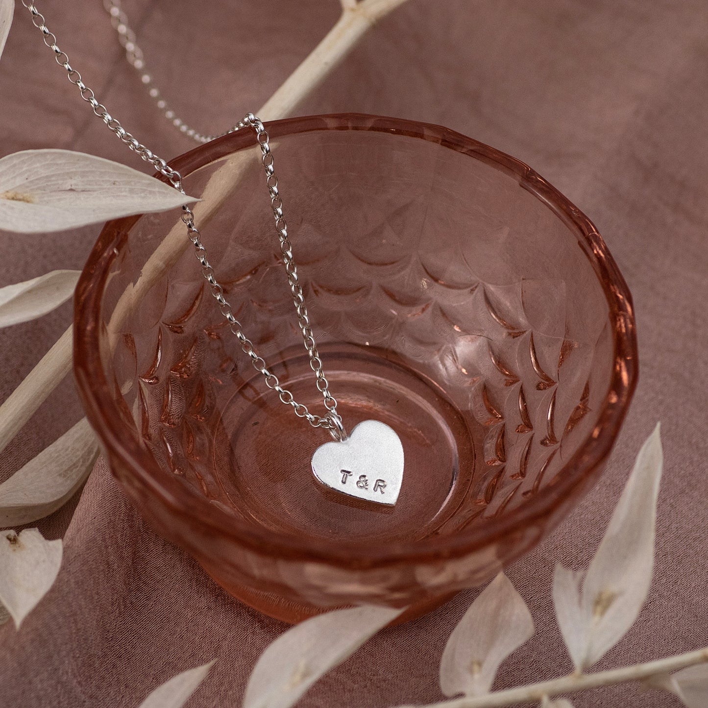 This personalised silver heart necklace, hand-stamped with up to three characters, makes a meaningful gift for a loved one.