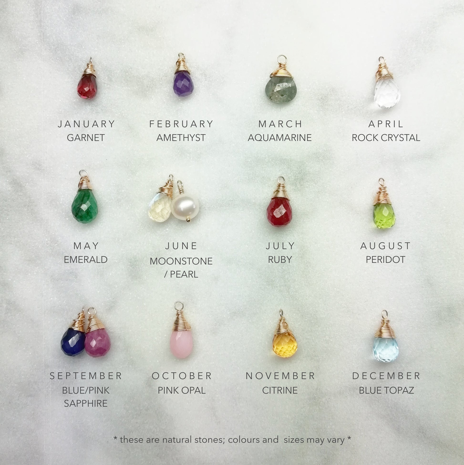 You choose the birthstone for the centre of the pendant, see image 3. Please note that the birthstones may vary in size, shape and shade from the examples.