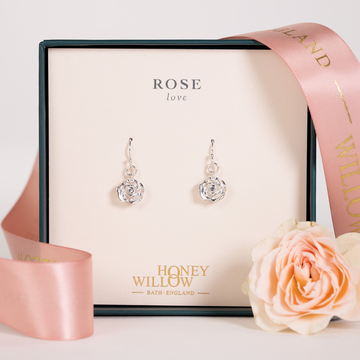 Show your love for her with dainty rose flower earrings, made with recycled silver.