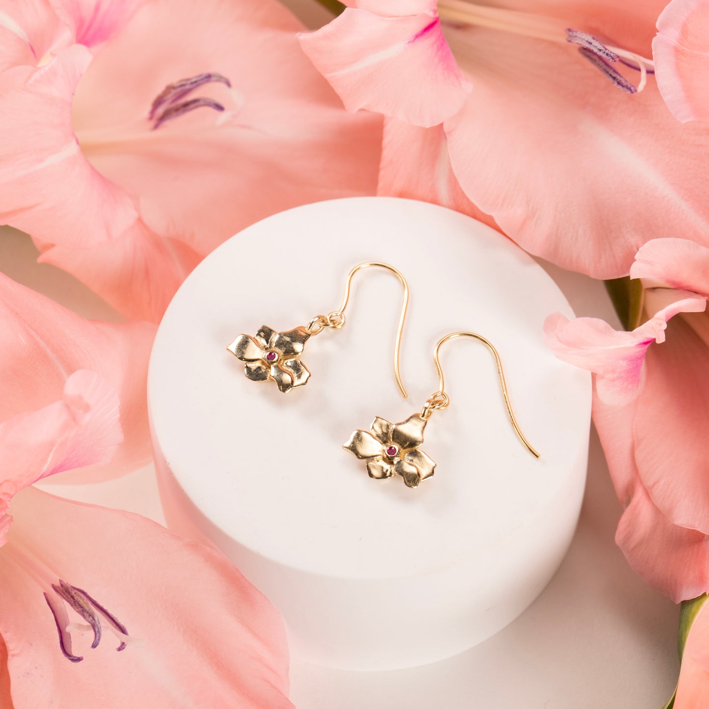 Ruby Anniversary Gift - Gladiolus Flower Earrings & Ruby - 9kt Gold