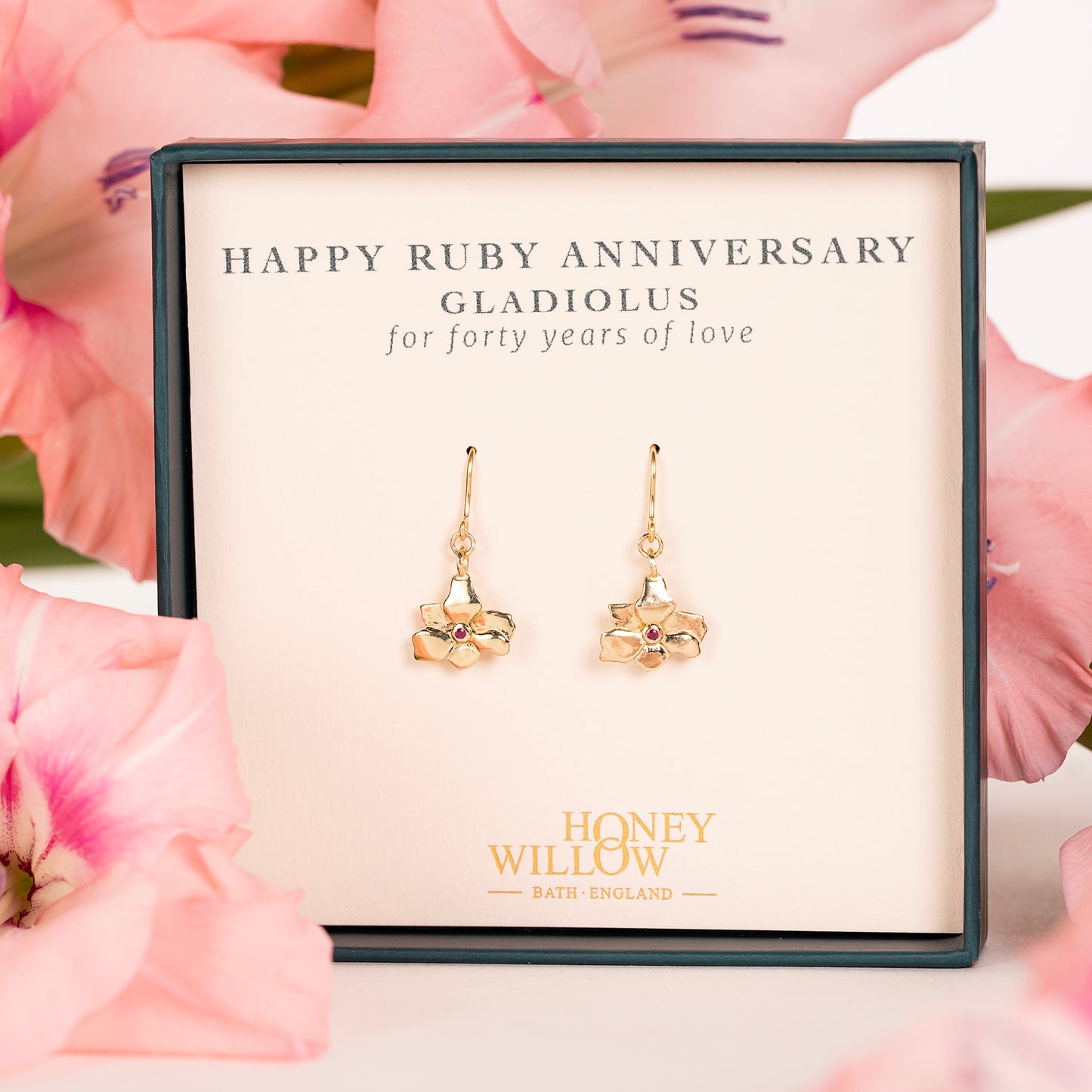 Celebrate your 40th anniversary with dainty gladiolus flower earrings, made with recycled 9kt gold and set with tiny rubies.