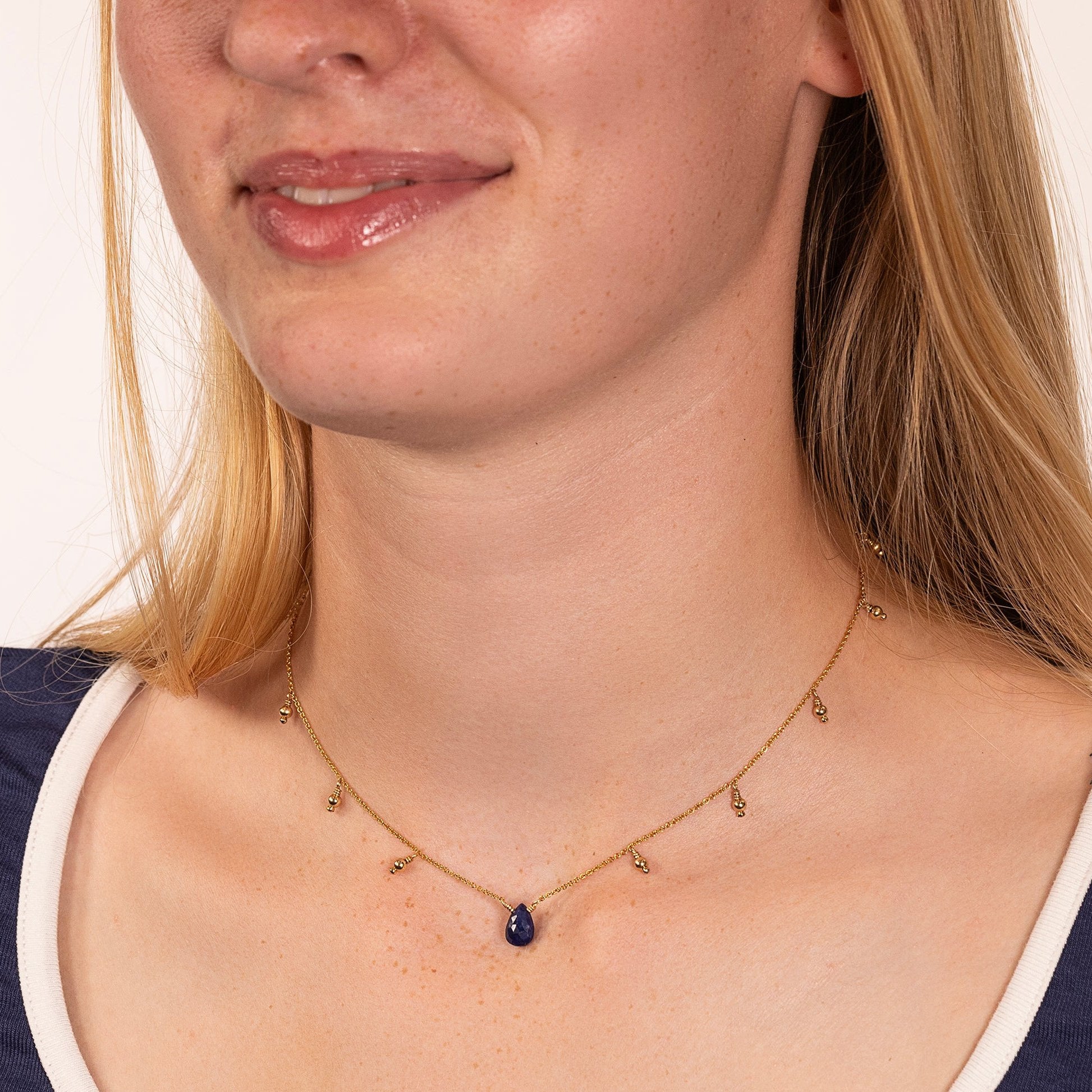Celebrate her September birthday with a birthstone choker, handmade with blue sapphire, birthstone for September and either silver or gold balls around the chain.