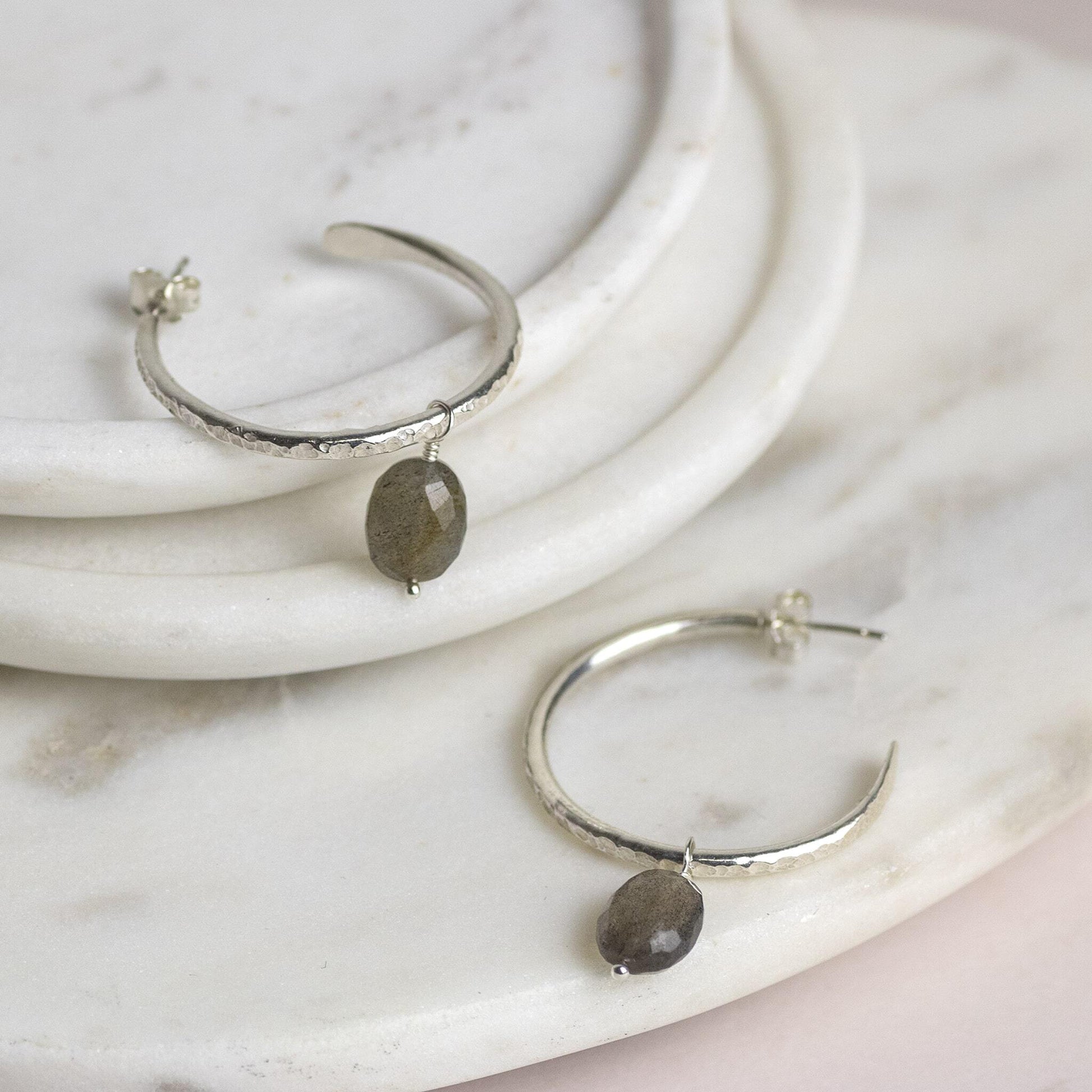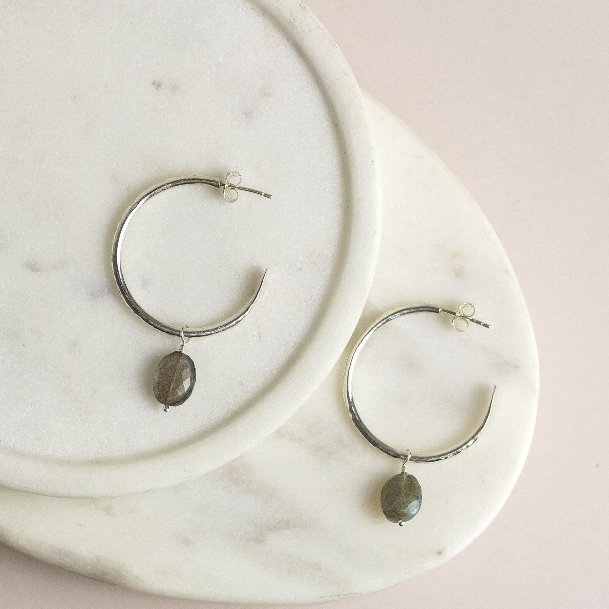 These chunky sterling hoop earrings are 3cm in diameter. A pair of A grade labradorite stones hang from the hoops, which can be removed, so the hoops can be worn with or without the labradorites.