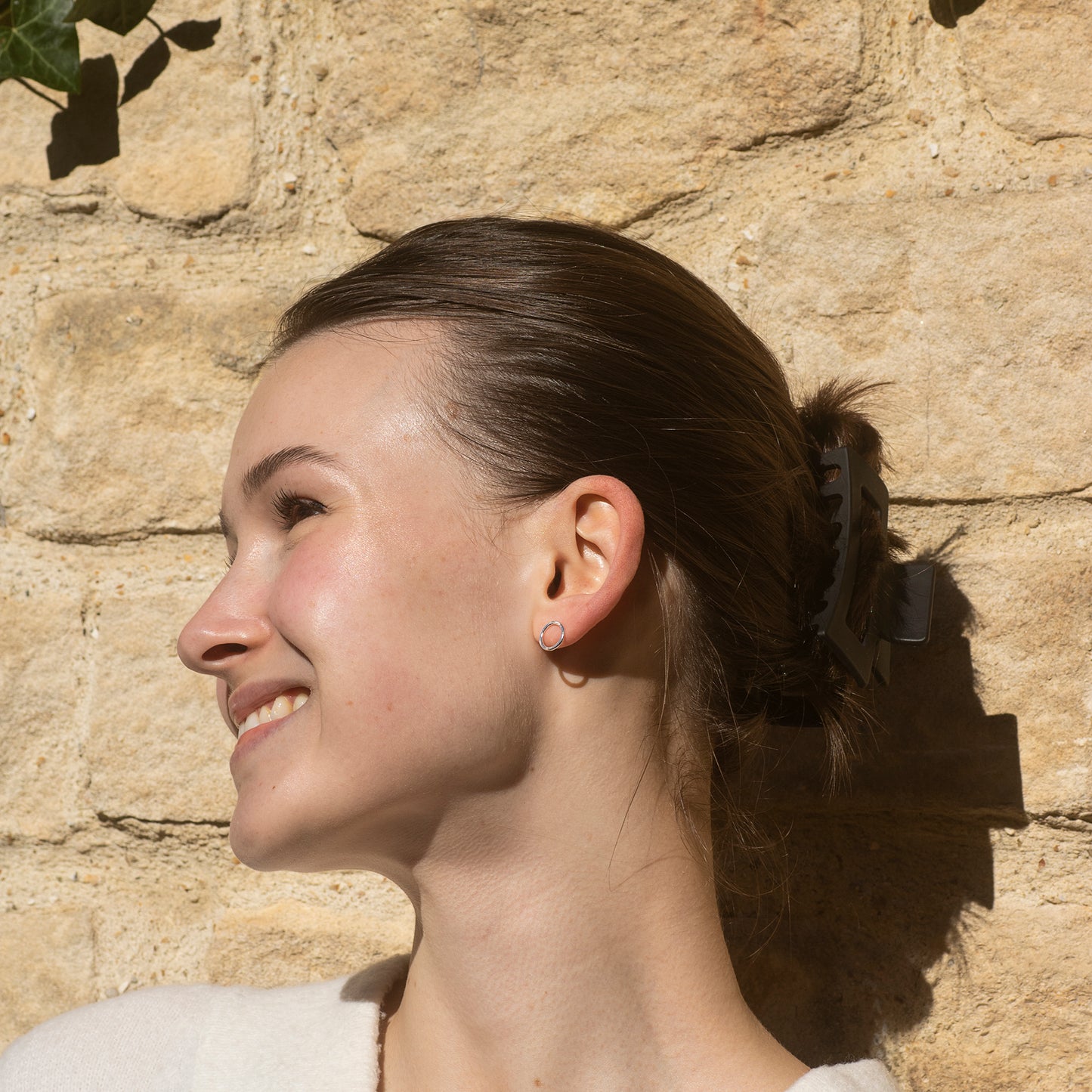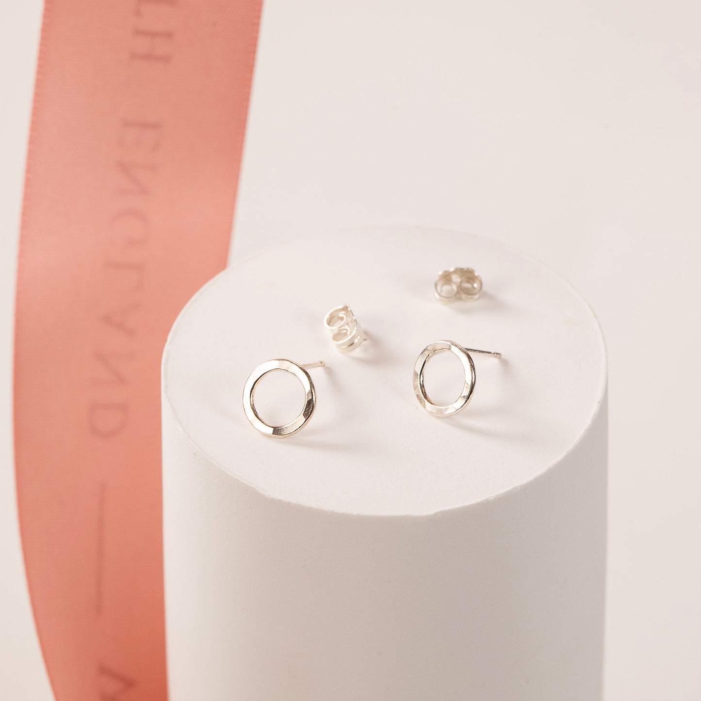 These dainty sterling silver circle studs are handmade in our workshop in Bath, England.