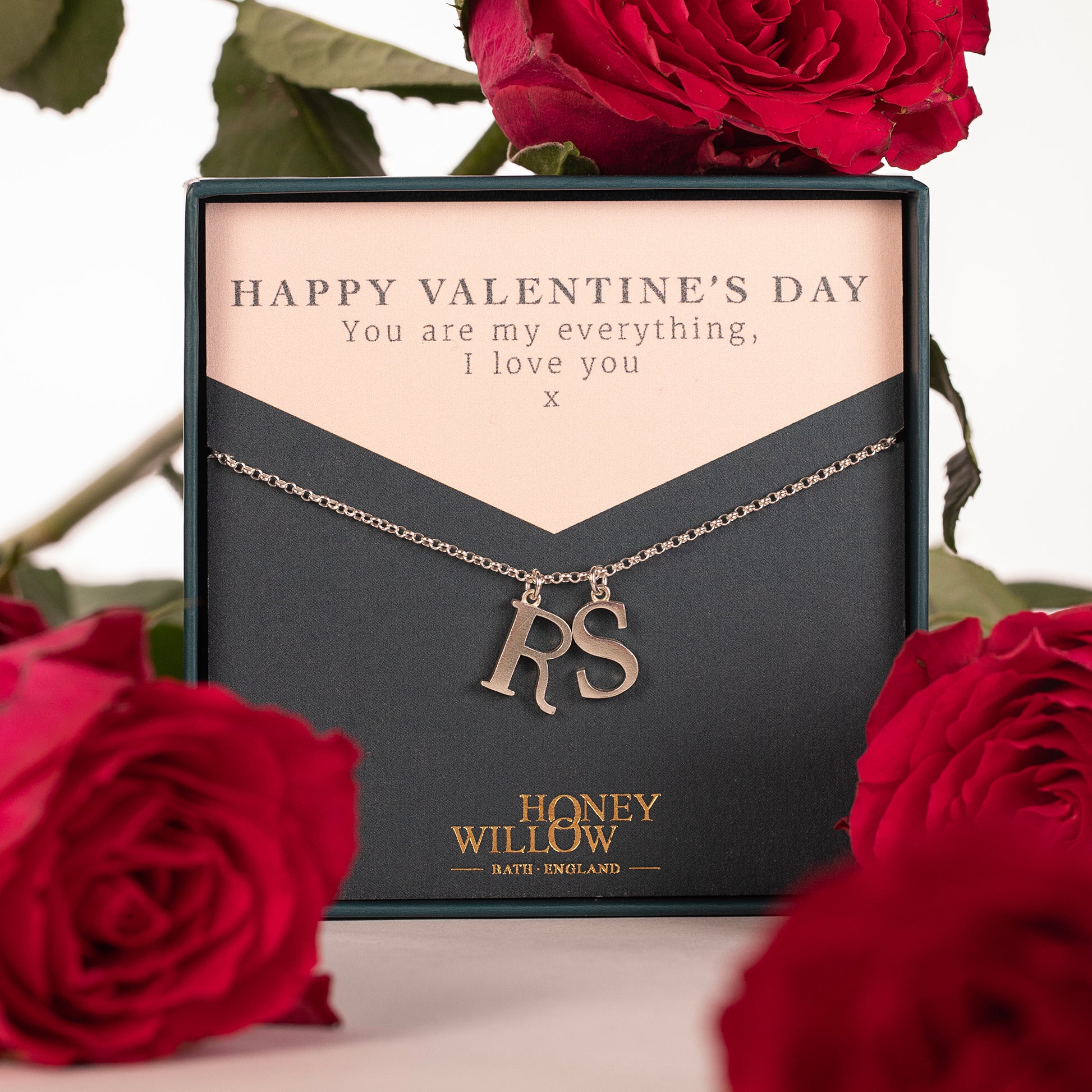 Celebrate your love for each other, with a silver double initial necklace. Handmade to order with the two initials of your choice.