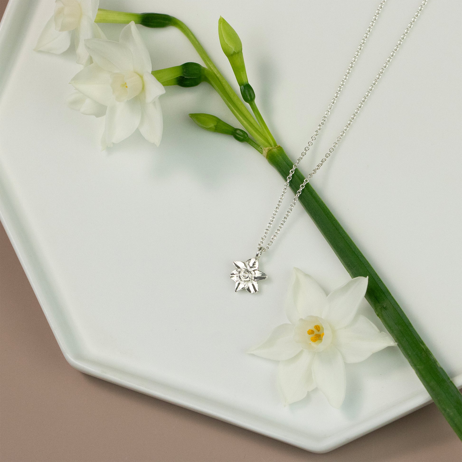 Celebrate your 10th anniversary with a dainty daffodil necklace, made with recycled silver.