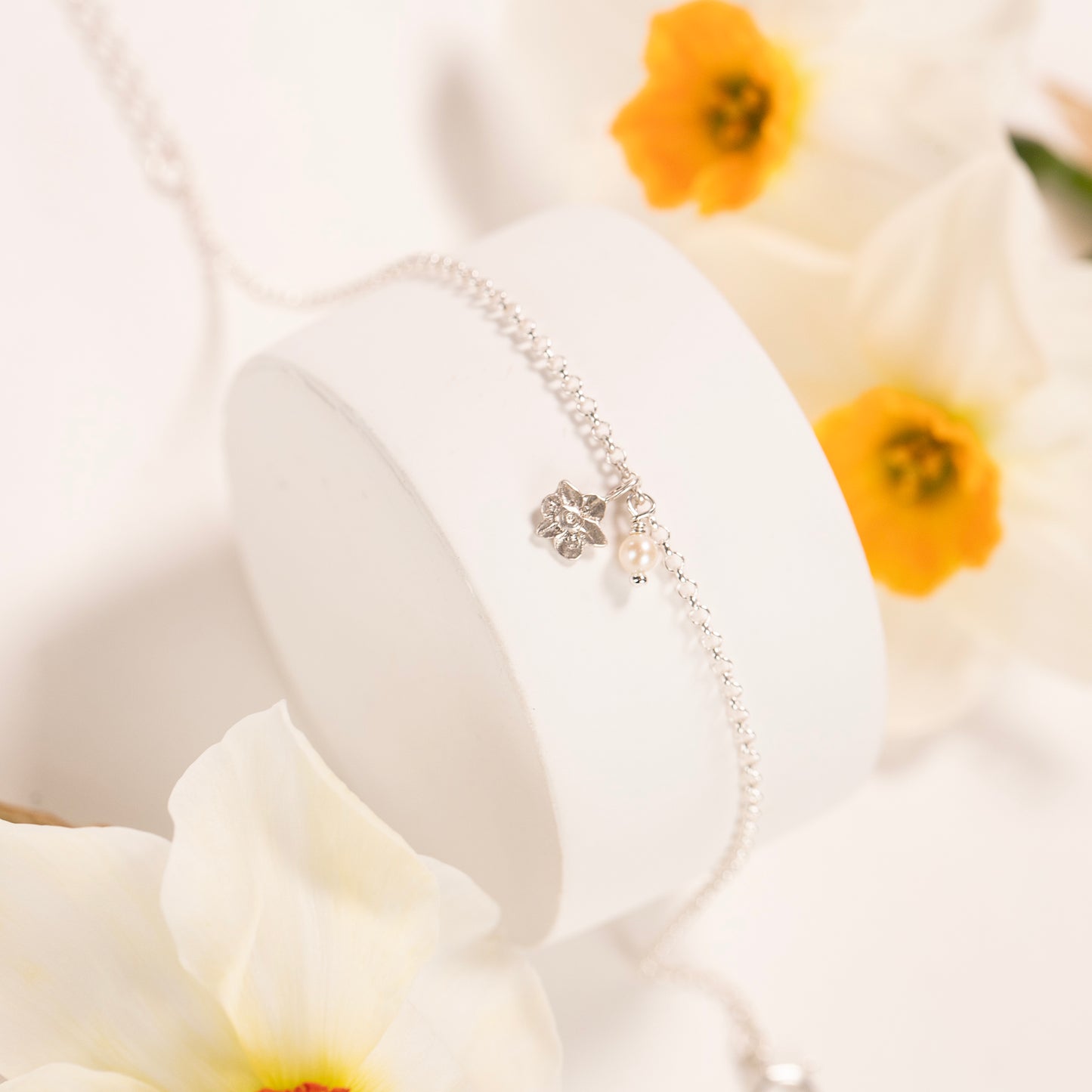 10th Anniversary Gift - Delicate Daffodil Flower & Pearl Bracelet - Silver