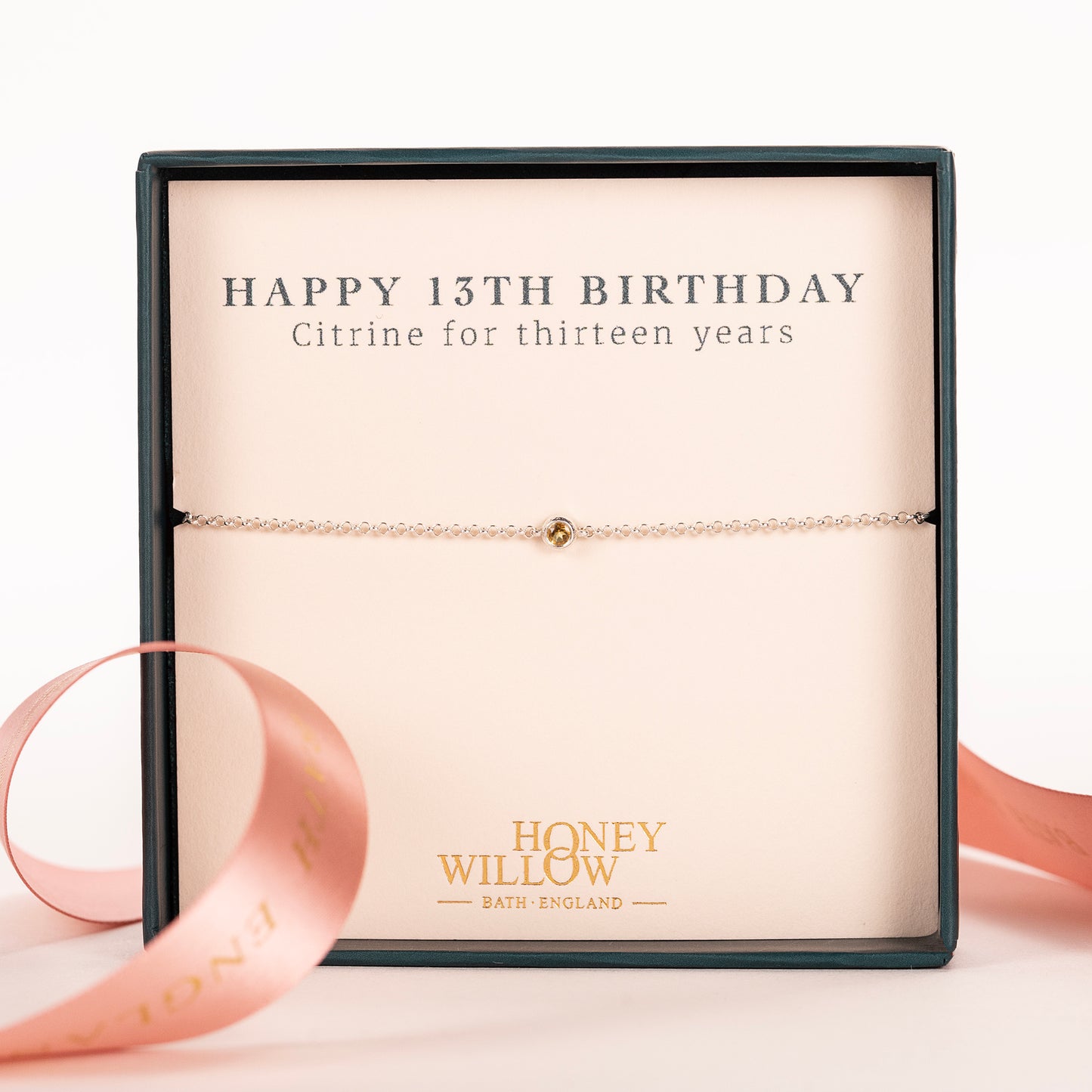 Celebrate her 13th birthday with a dainty silver bracelet, handmade with a tiny genuine citrine.