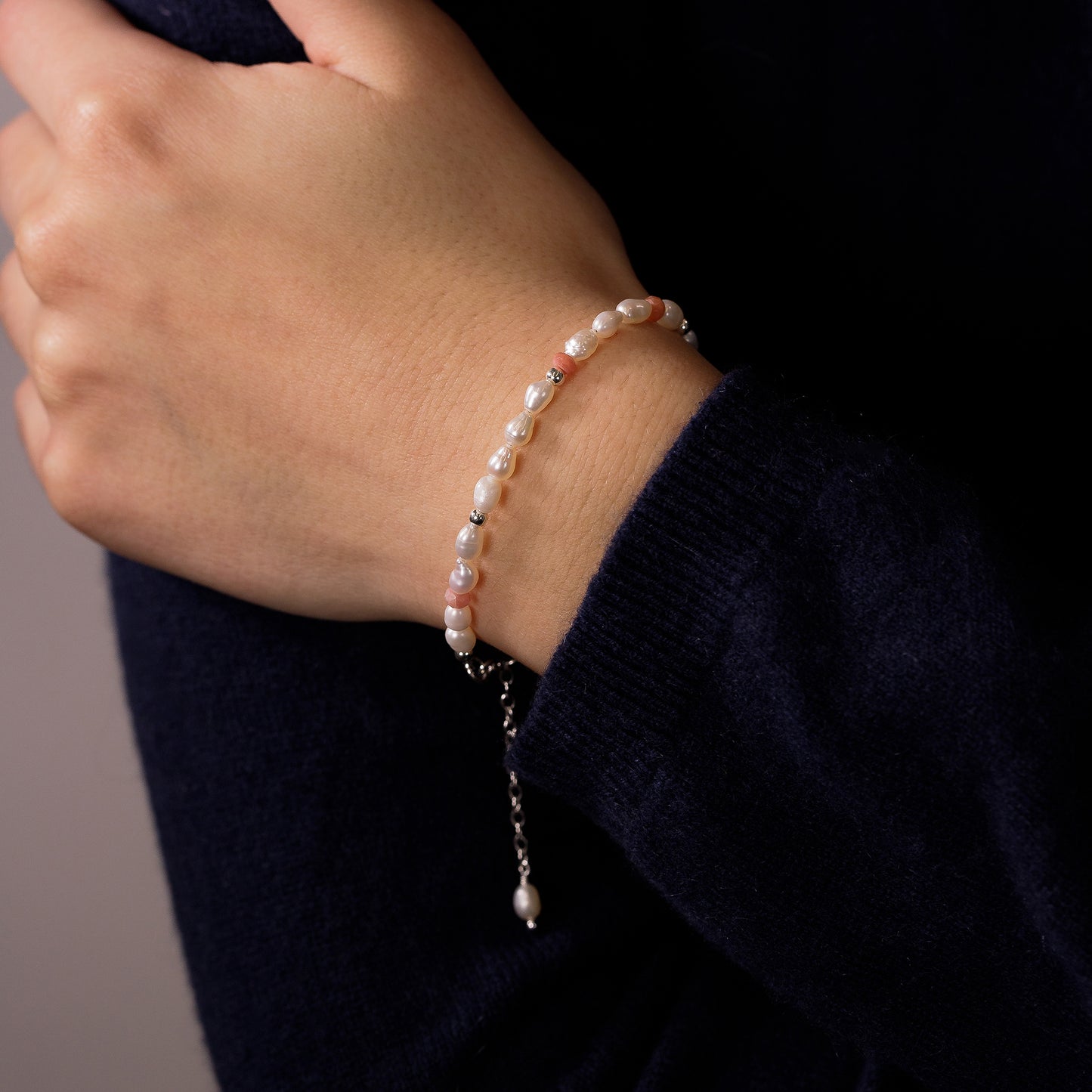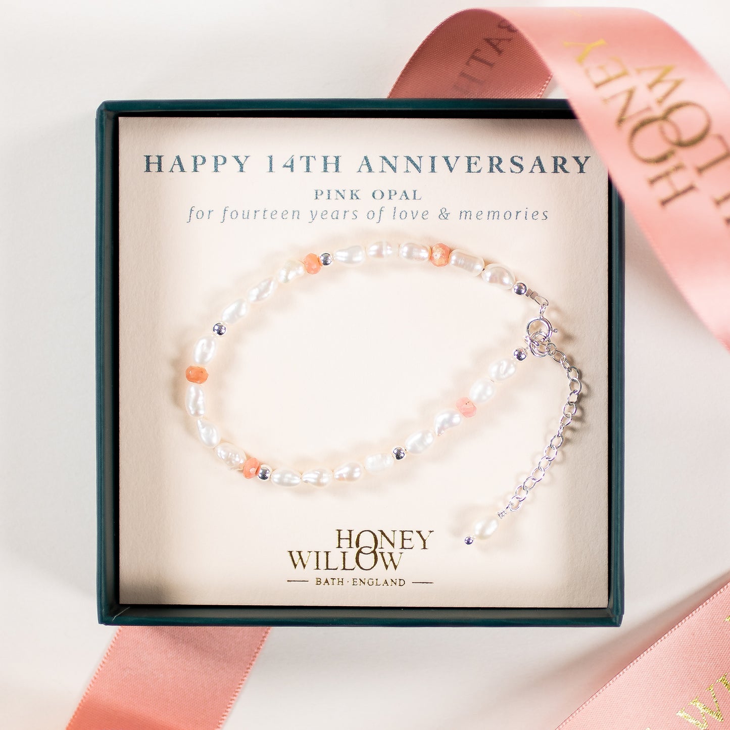 Celebrate your fourteenth anniversary with a delicate bracelet handmade with seed pearls and pink opal stones, which symbolise the fourteenth anniversary.