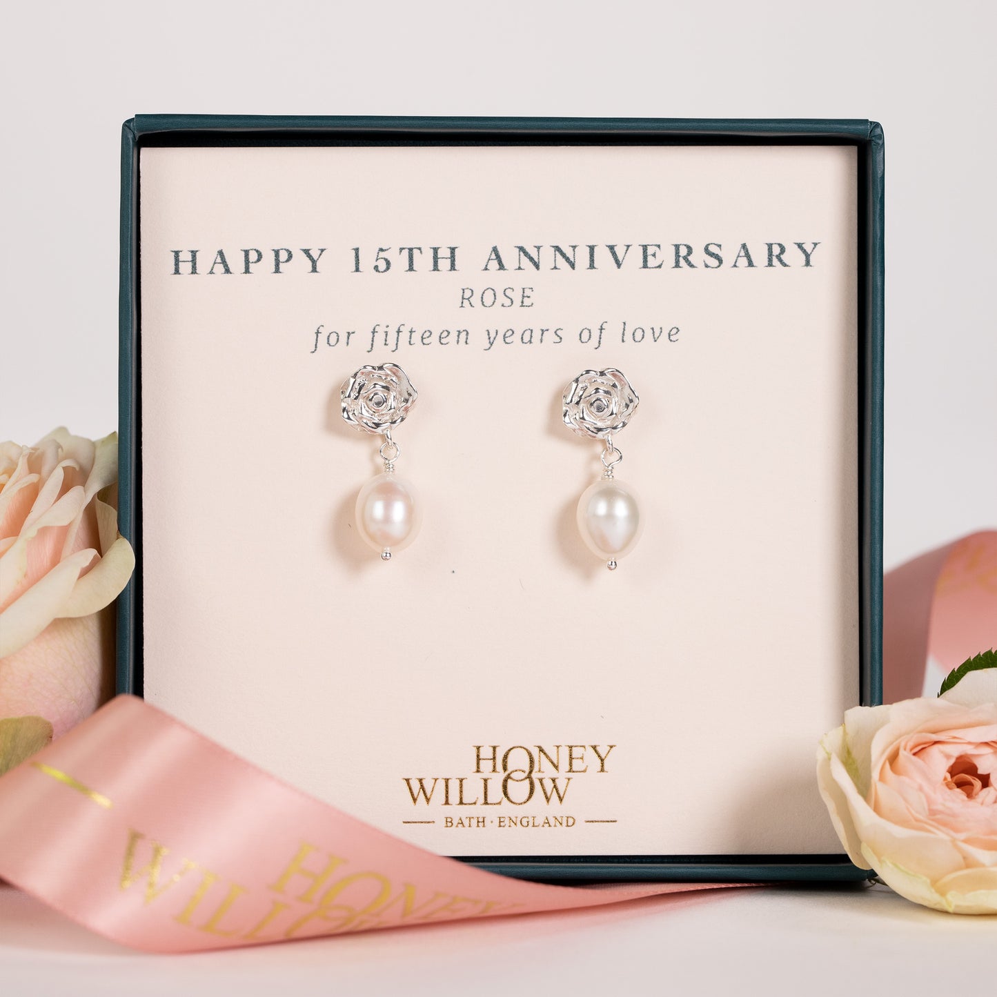 Celebrate your fifteenth anniversary with rose flower earrings, made with recycled sterling silver and freshwater pearls.