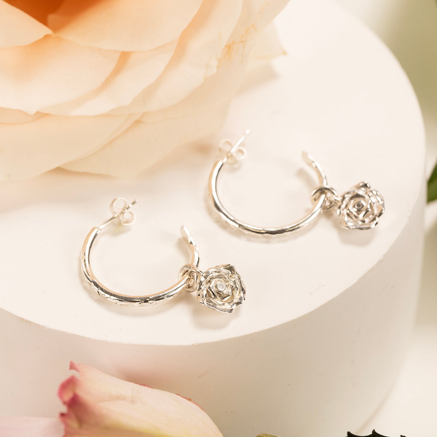 15th Anniversary Gift - Rose Flower Hoop Earrings - Silver - 2cm