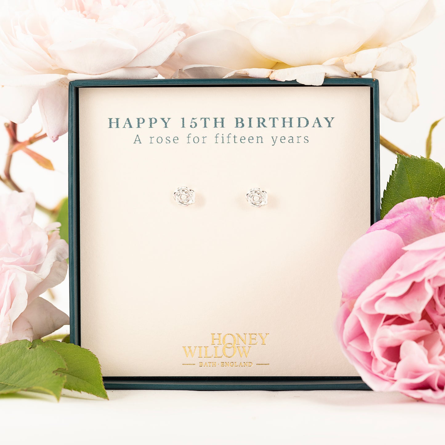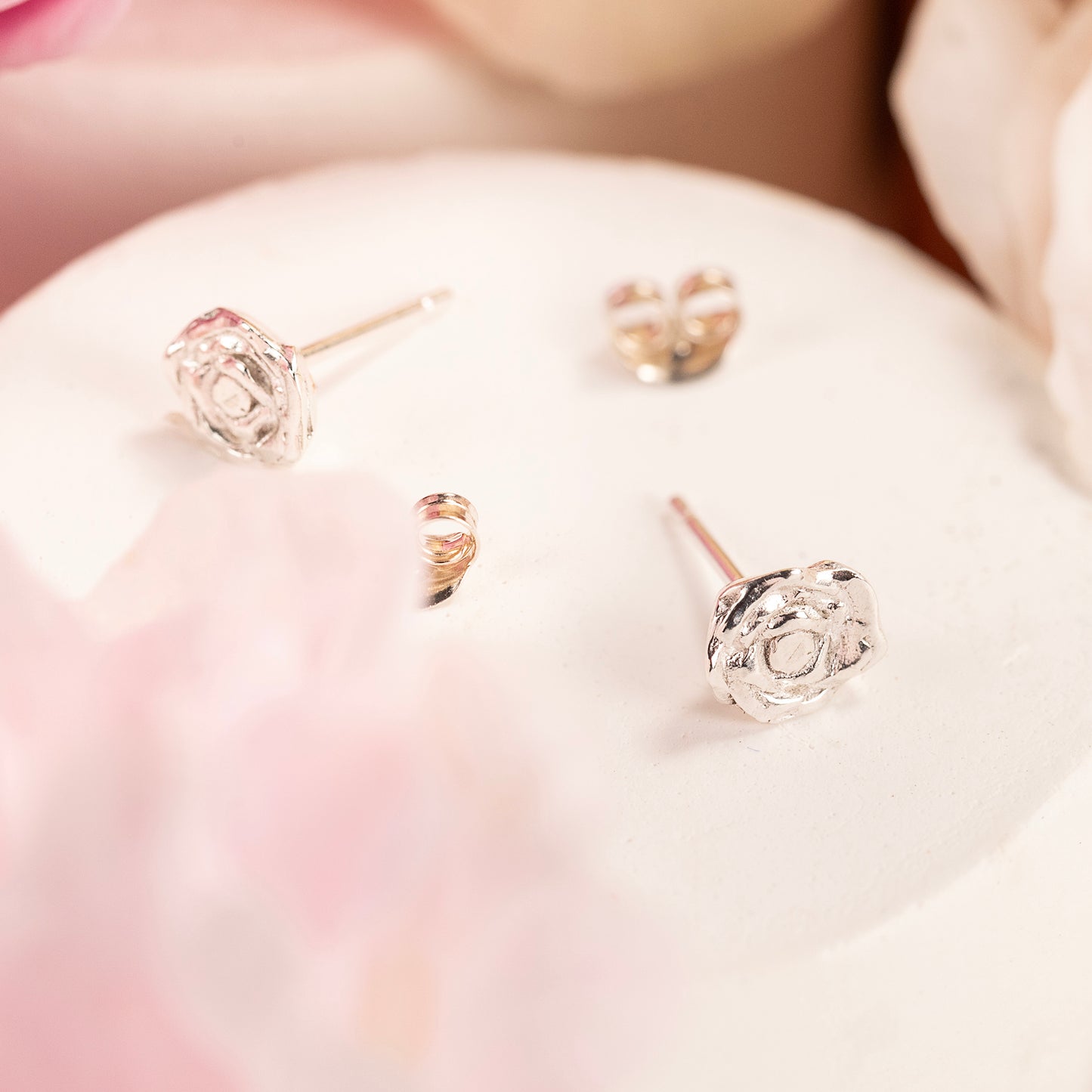 Celebrate your fifteenth anniversary with dainty rose flower stud earrings, made with recycled silver.