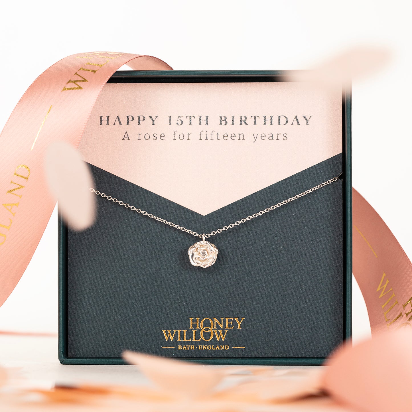 Celebrate her 15th birthday with a dainty rose flower necklace, made with recycled silver.