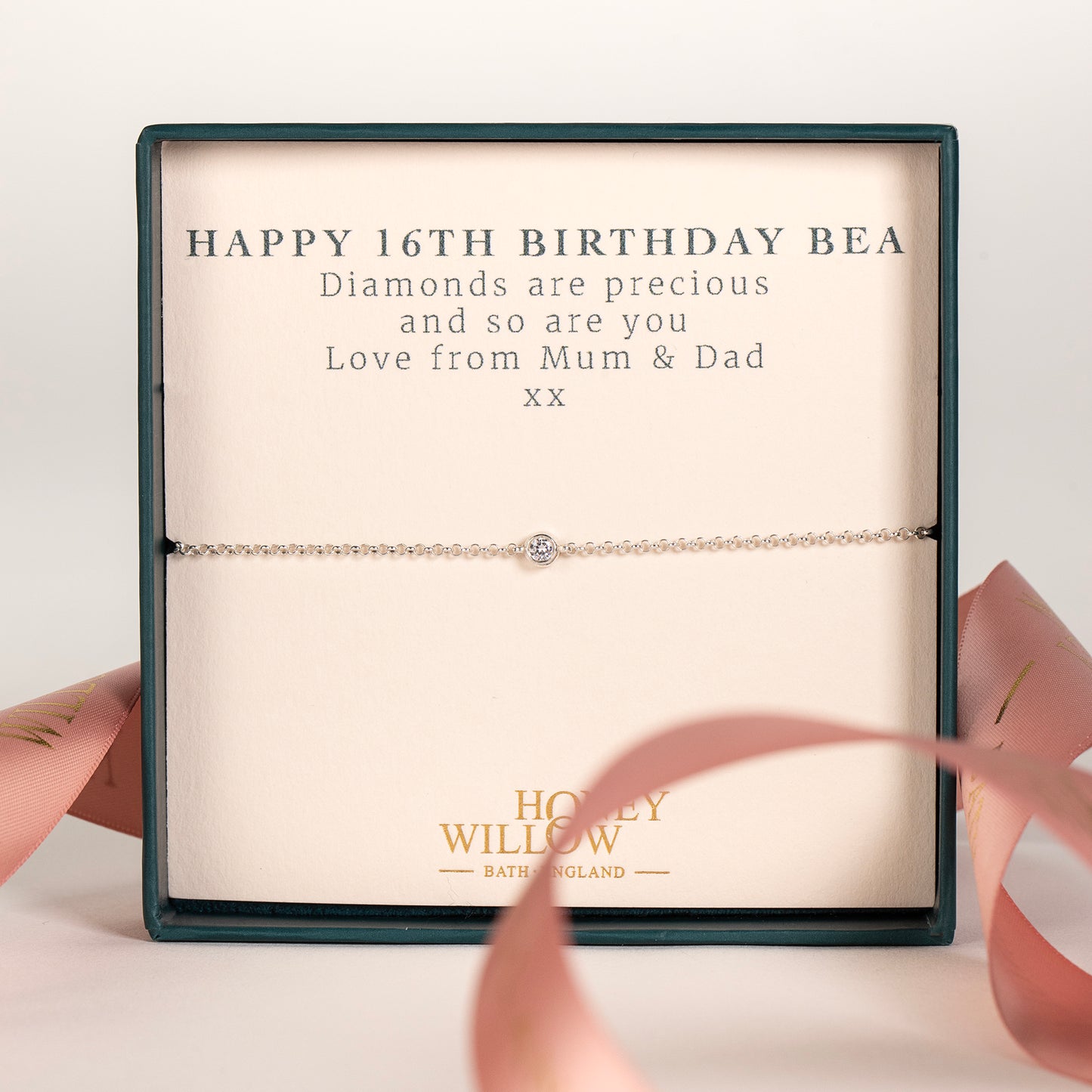 Celebrate her 16th birthday with a dainty silver bracelet, handmade with a single lab-grown diamond.