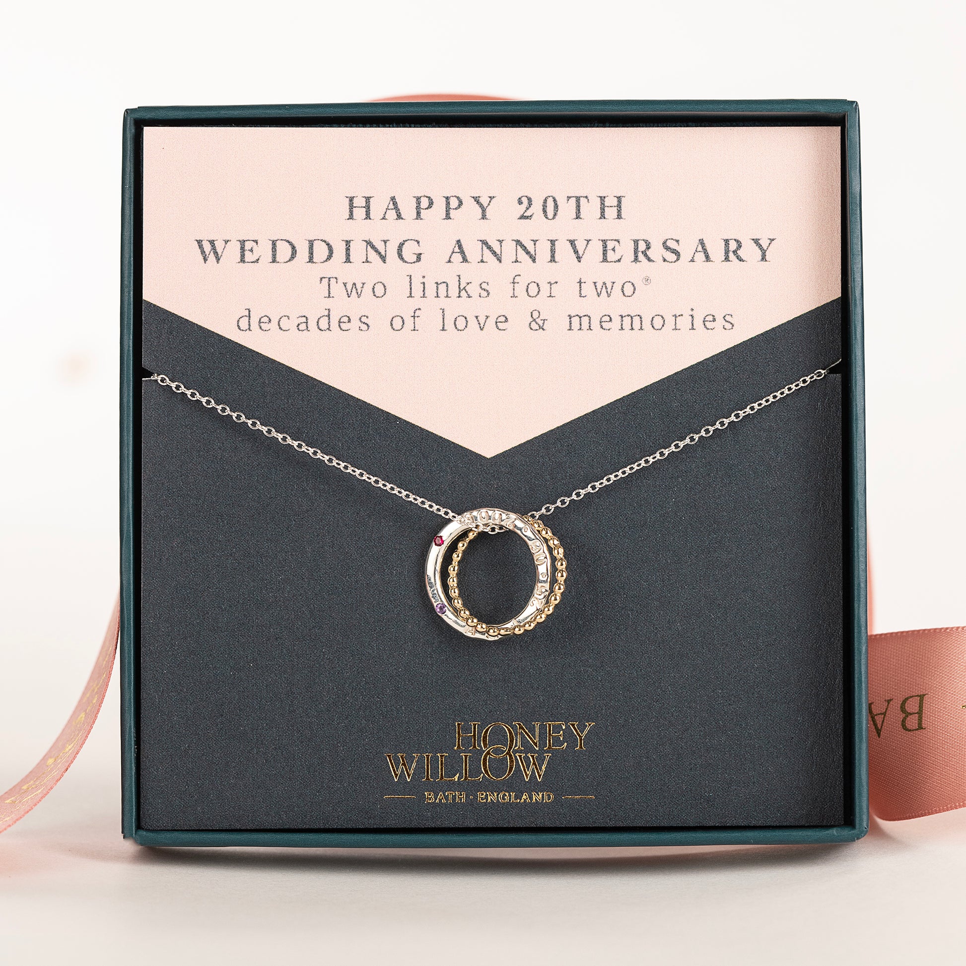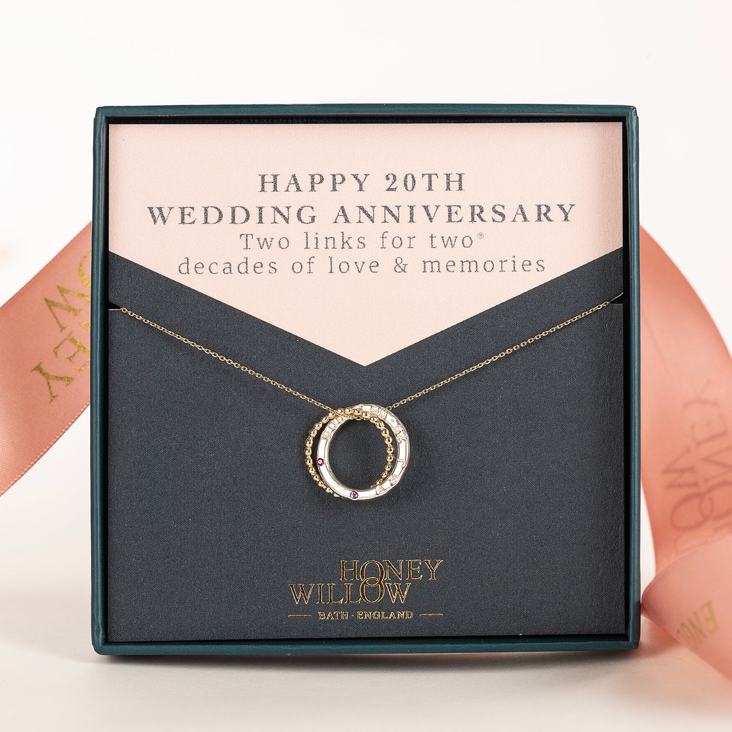 Celebrate your 20th anniversary with a meaningful personalised gift. This petite double linked necklace is hand-stamped with your initials, the date of your wedding and set with your birthstones.