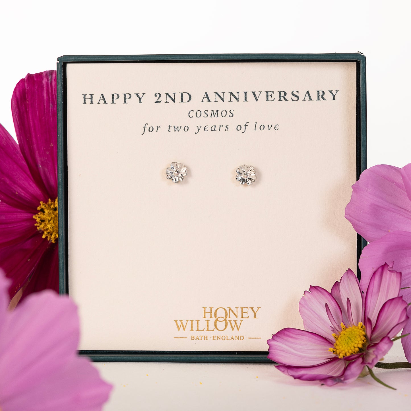 Celebrate your second anniversary with dainty cosmos stud earrings.