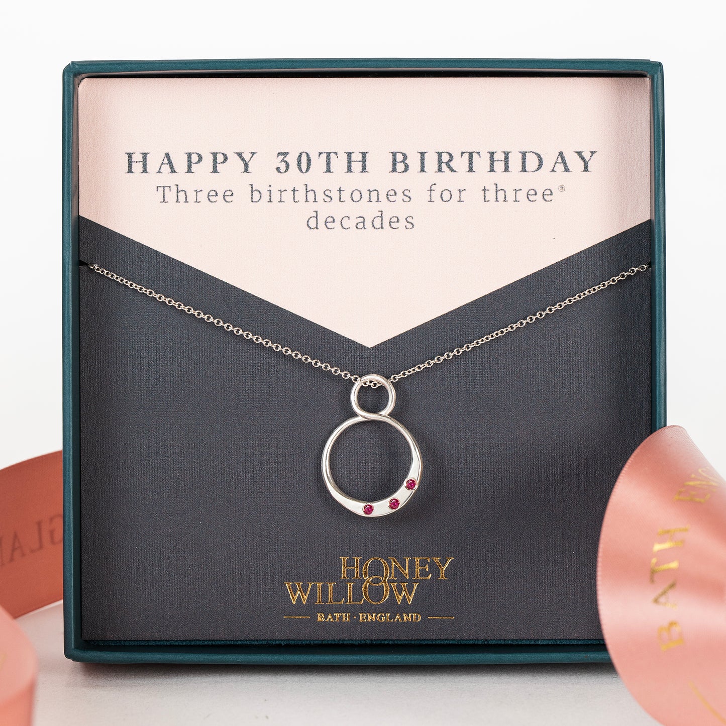 Celebrate her 30th birthday with a silver infinity necklace, handmade with three birthstones for three® decades.