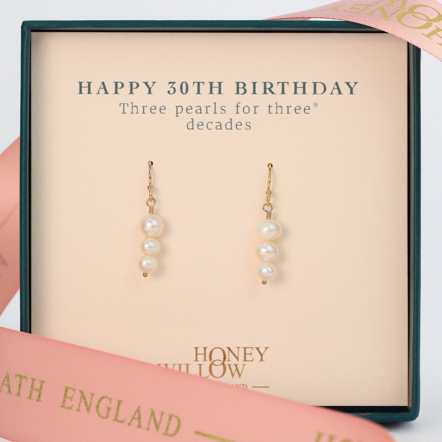 Celebrate her 30th birthday milestone with these pearl trio earrings - three pearls for three® decades.