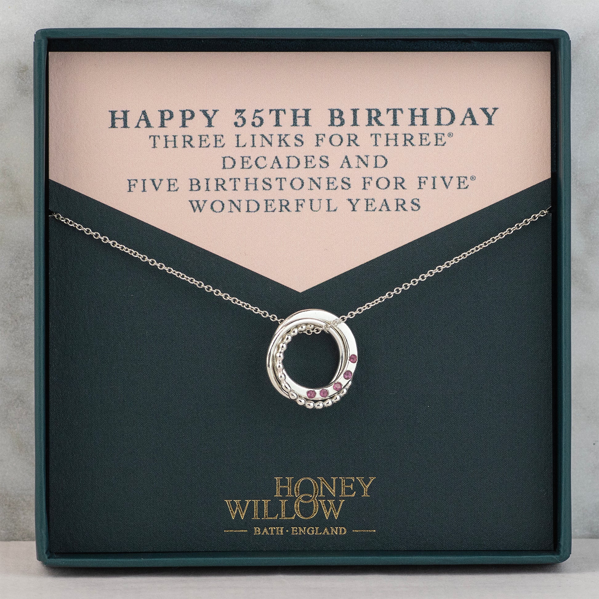Celebrate her 35th birthday with a sterling silver necklace handmade to order just for her - three links for three® decades and five birthstones for five® wonderful years.