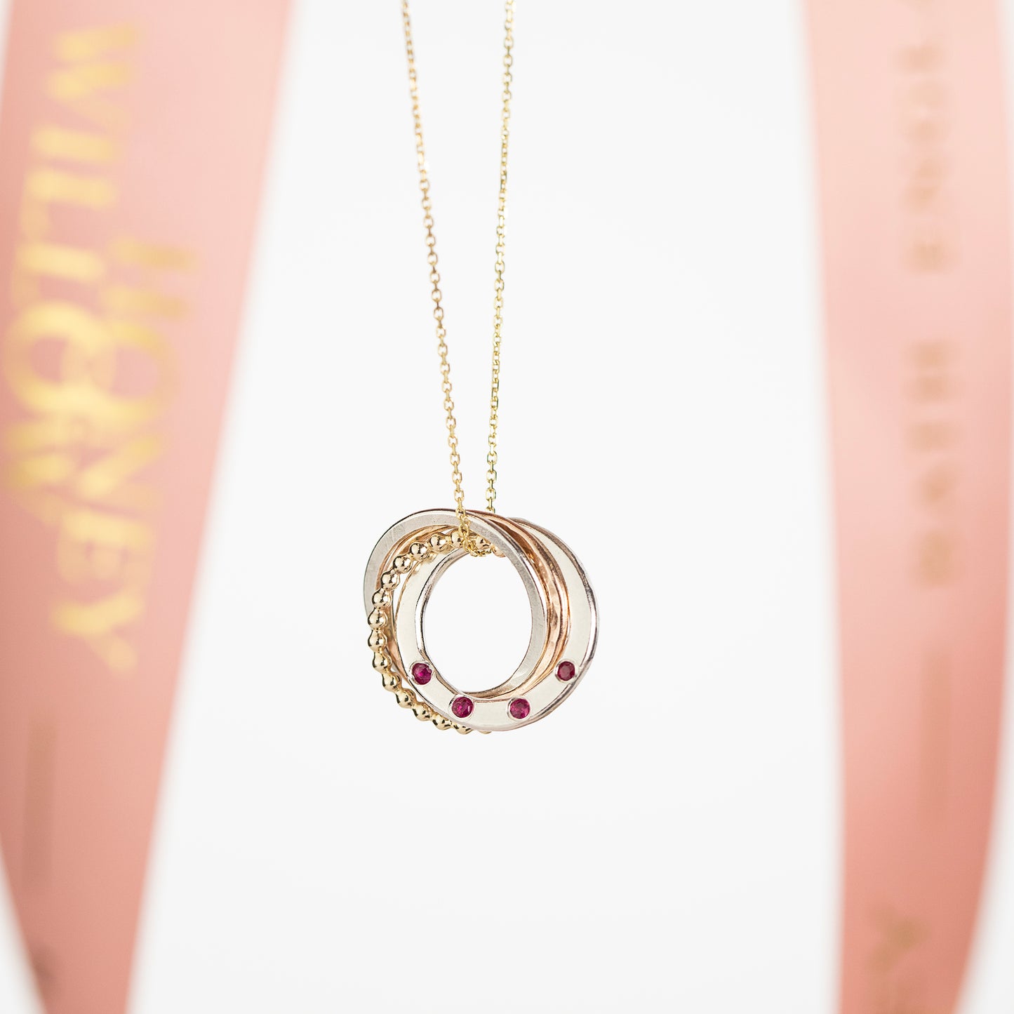 Circles symbolise infinite love, strength, protection and unity. We make her pendant with four linked circles, giving each link a different texture to represent each unique decade. One link is set with four birthstones, see image 3 for examples.