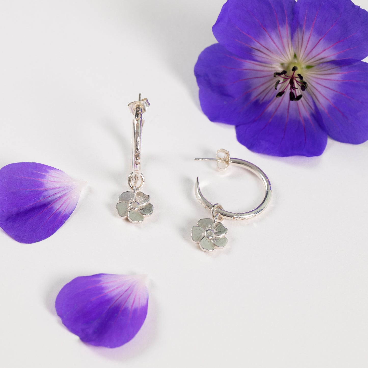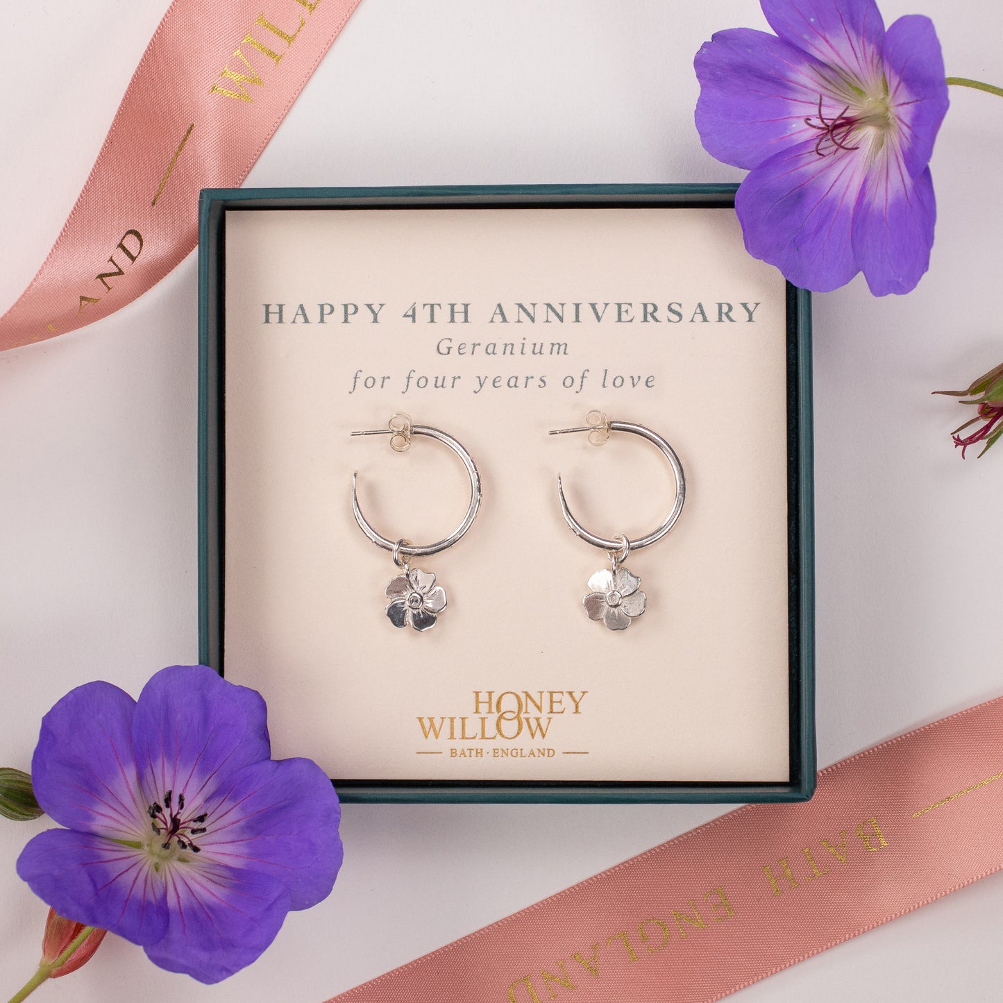 Celebrate your fourth anniversary with unique geranium flower hoop earrings, handmade with recycled silver.