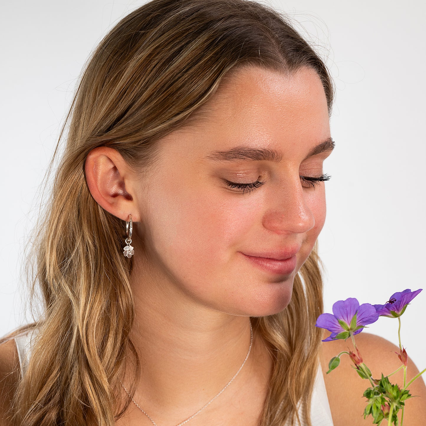 4th Anniversary Gift - Geranium Flower Hoop Earrings - Silver - 2cm