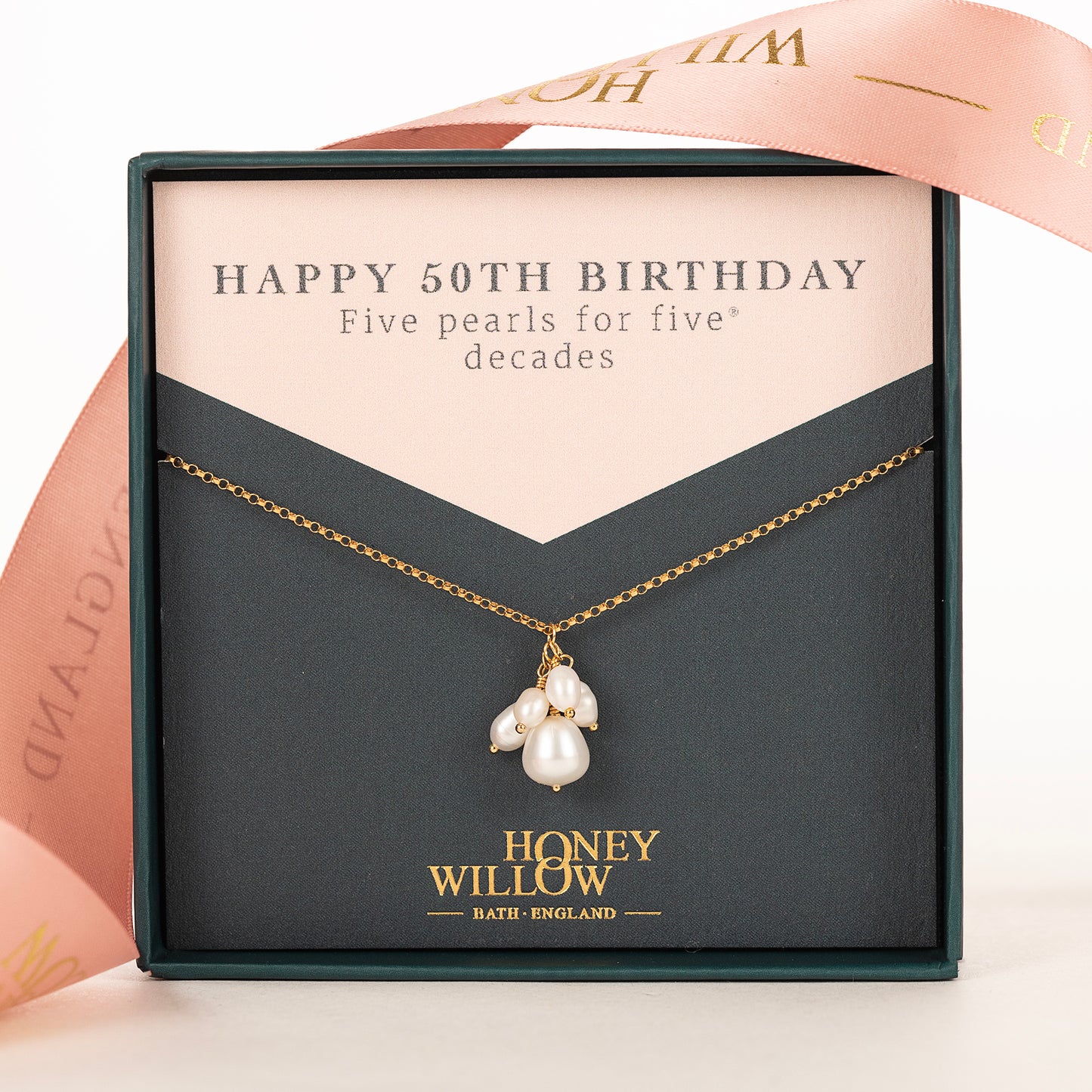 Give her a five pearls for five® decades necklace, designed and handmade in Bath, England. Honey Willow is a family business, founded in 2010.