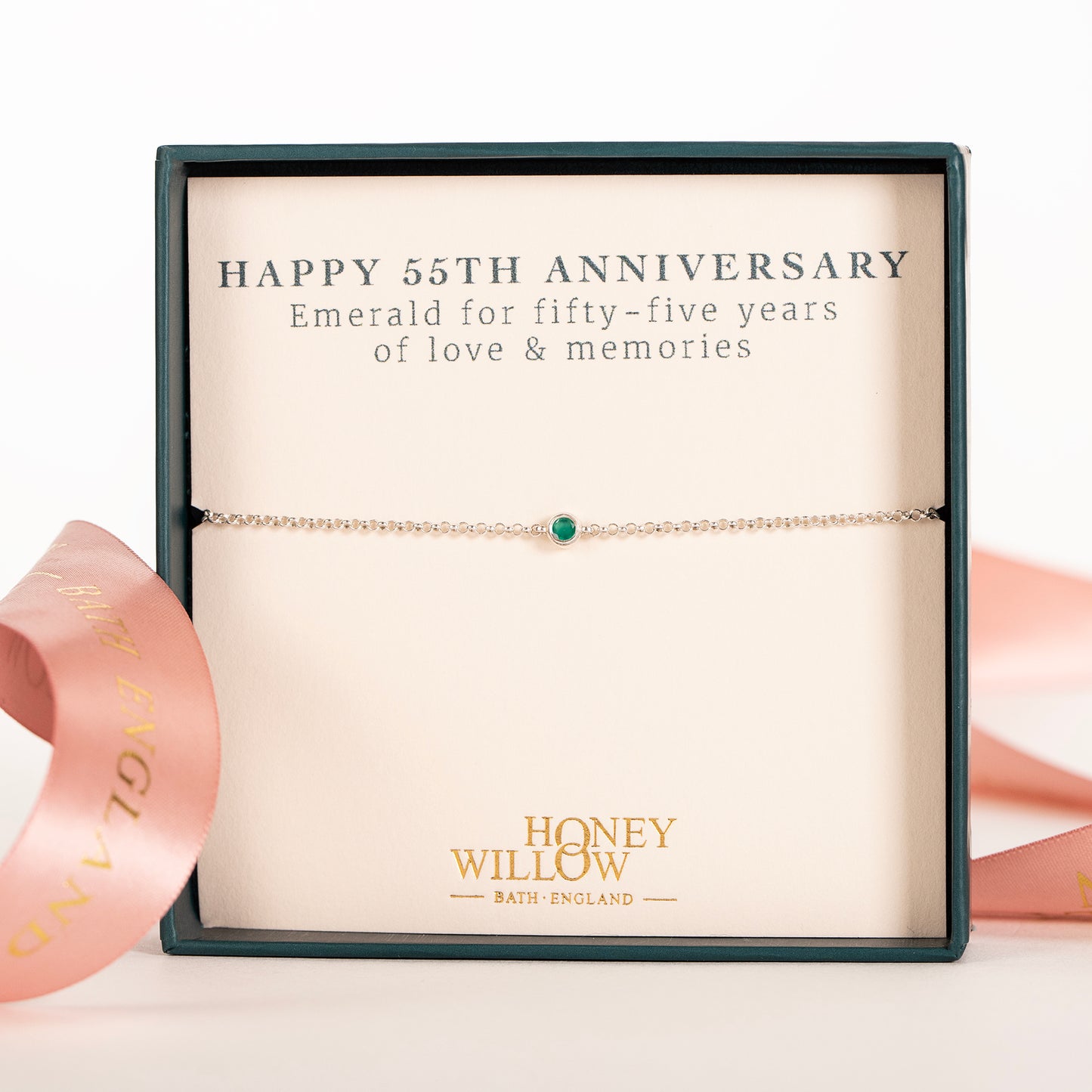 Celebrate your 55th anniversary with a dainty silver bracelet, handmade with a genuine emerald. The emerald symbolises 55 years.