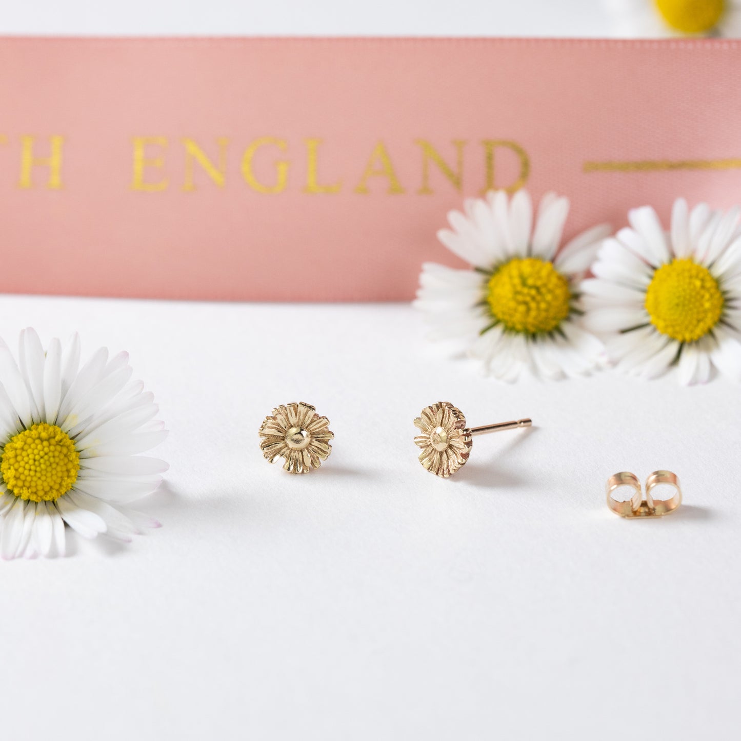Celebrate your 5th anniversary with daisy flower stud earrings, made with recycled 9kt gold.