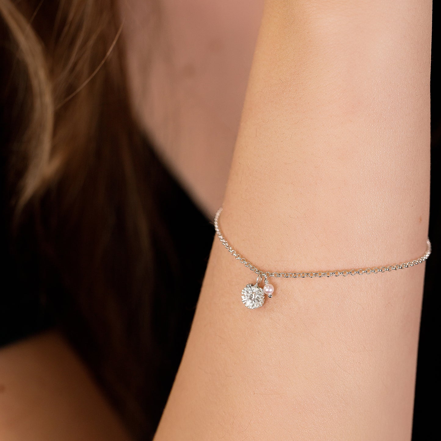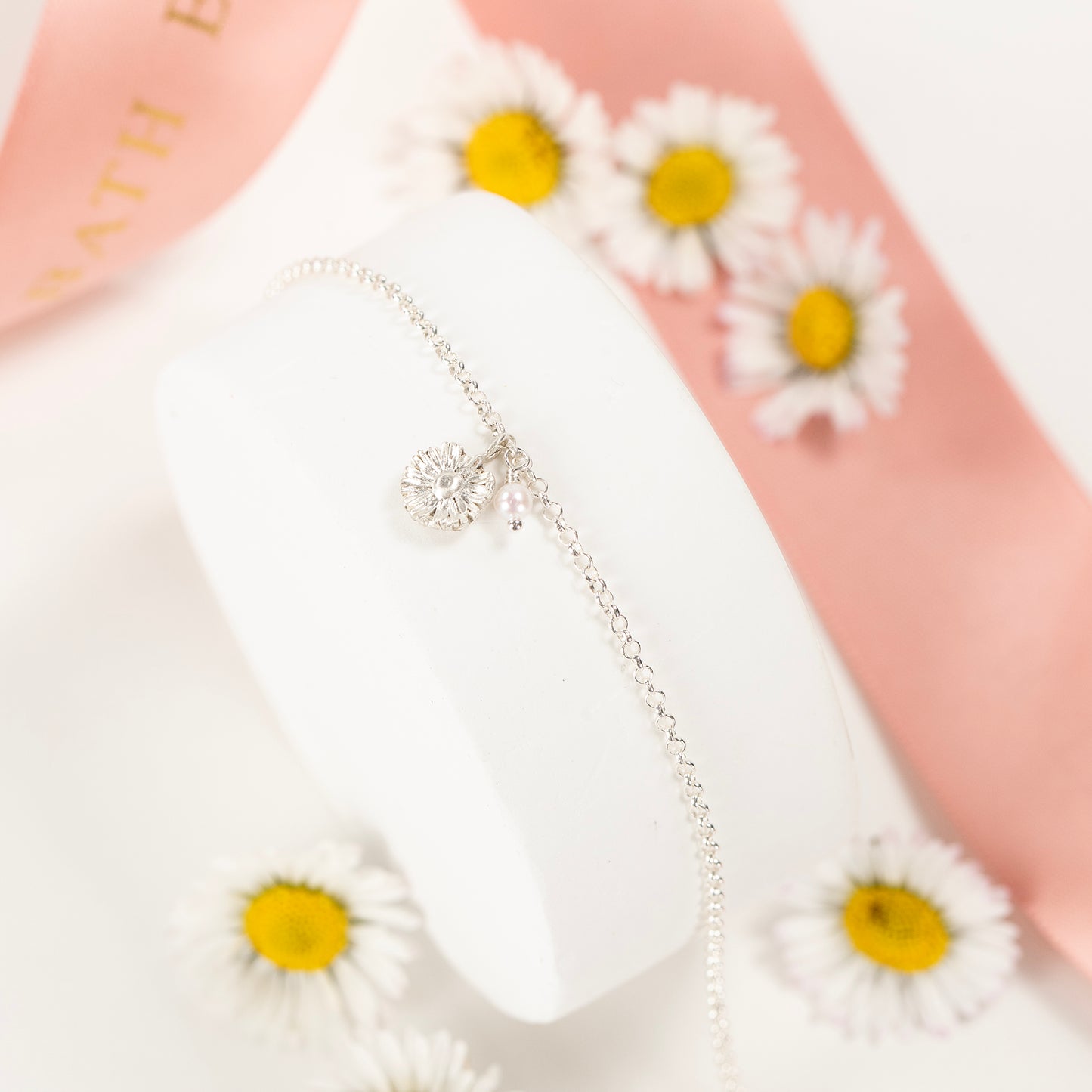 5th Anniversary Gift - Delicate Daisy Flower & Pearl Bracelet - Silver