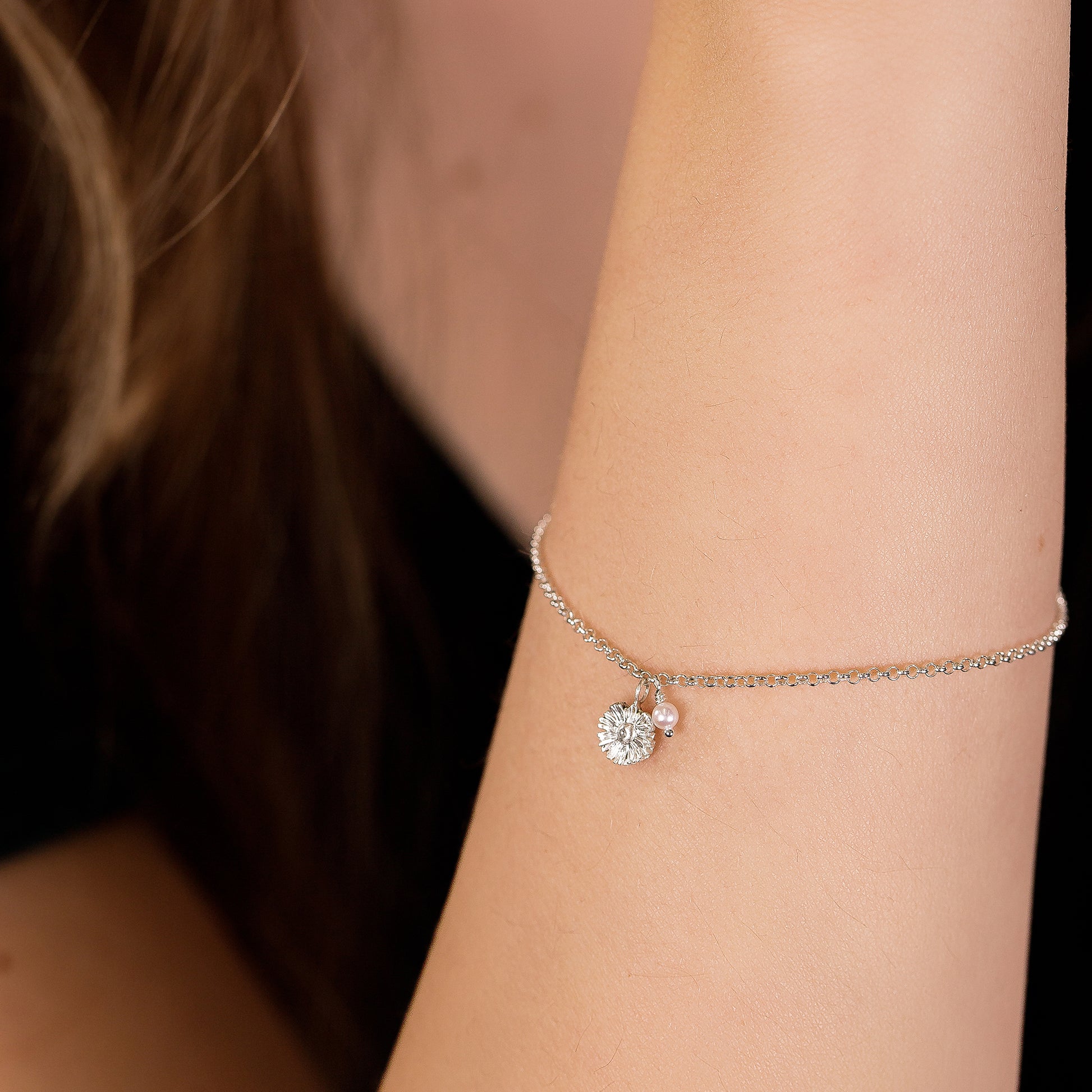 The daisy charm is 5mm in diameter. A small freshwater pearl also hangs from the bracelet.