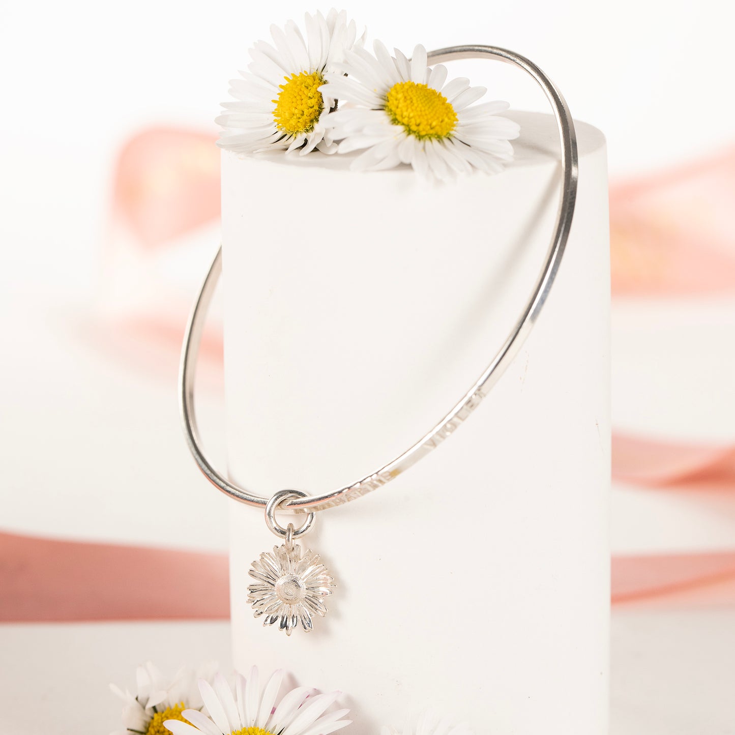 5th Anniversary Gift - Personalised Daisy Flower Bangle - Silver