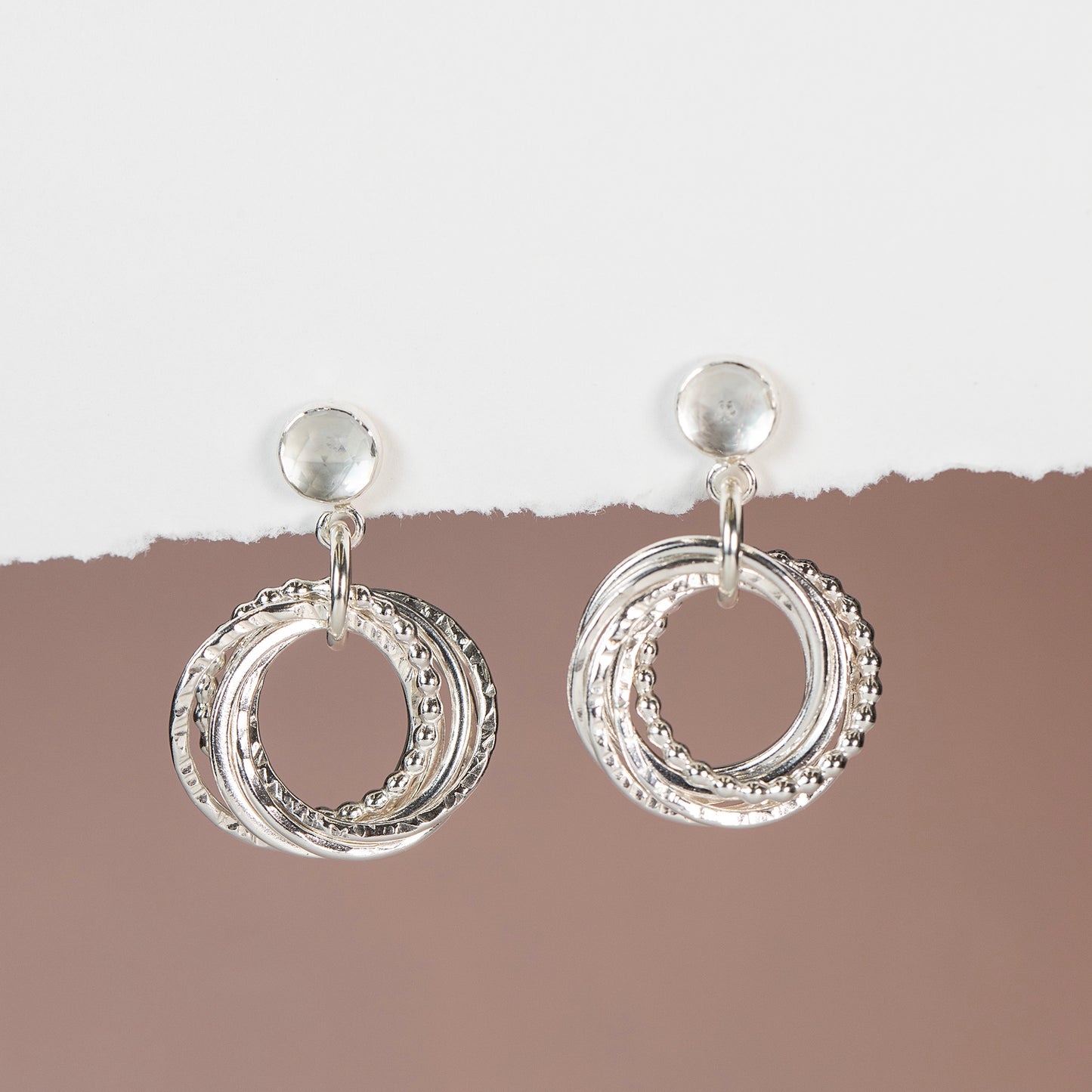 Circles symbolise infinite love, strength, protection and unity. Each earring is handmade with six linked circles to represent her six decades.