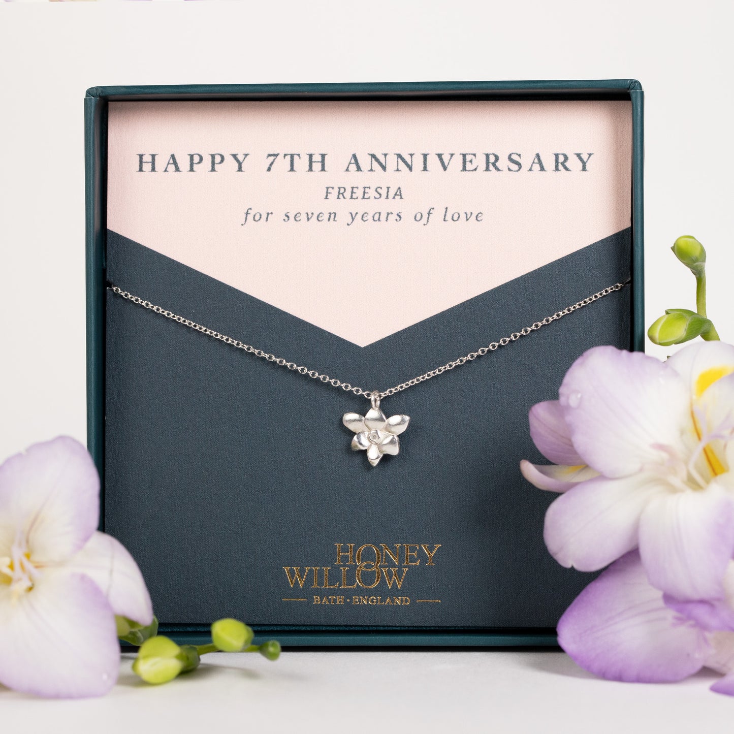 Celebrate your 7th anniversary with a unique silver freesia necklace.