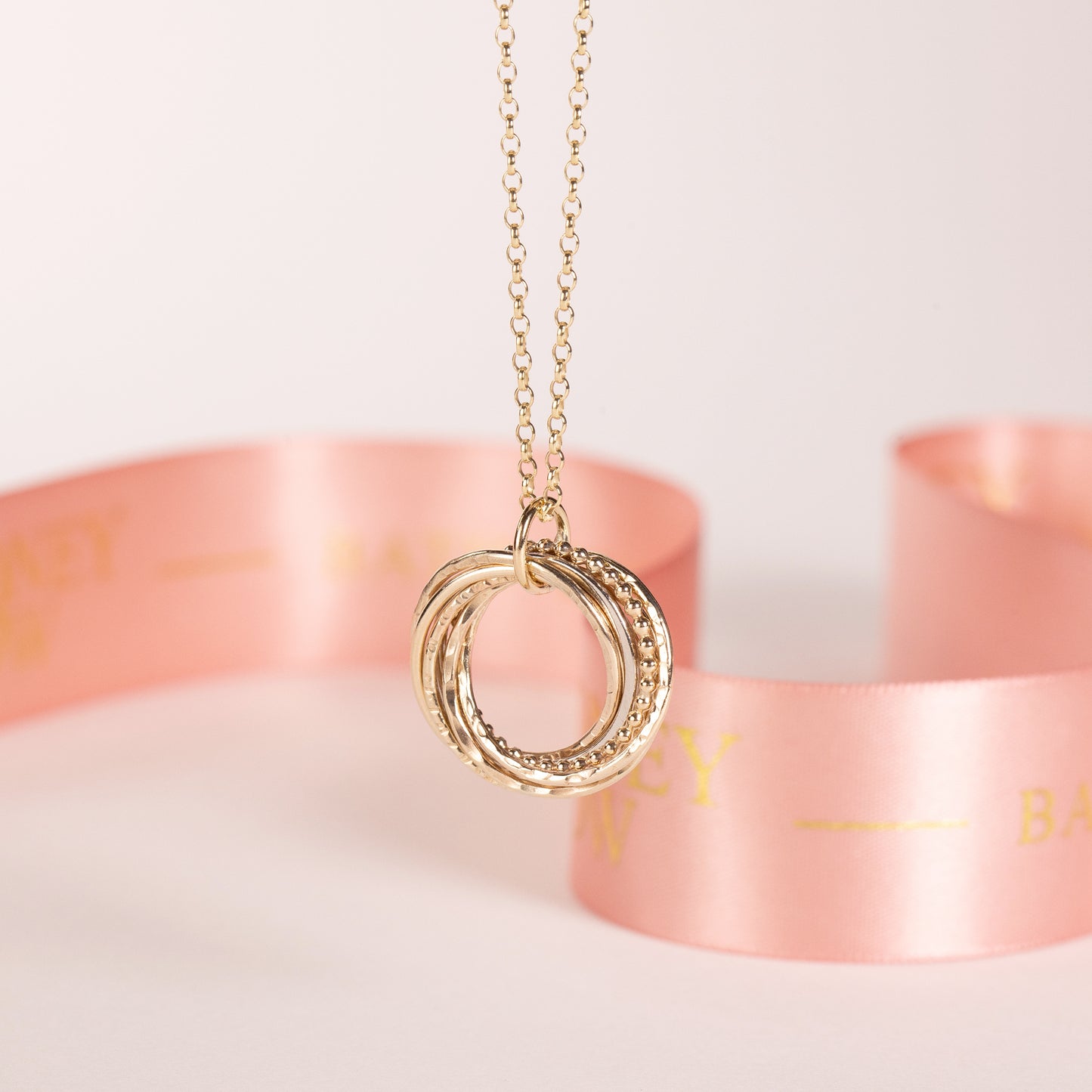 Circles symbolise infinite love, strength, protection and unity.  We make her pendant with seven linked circles, giving each link a different texture to represent each unique decade.