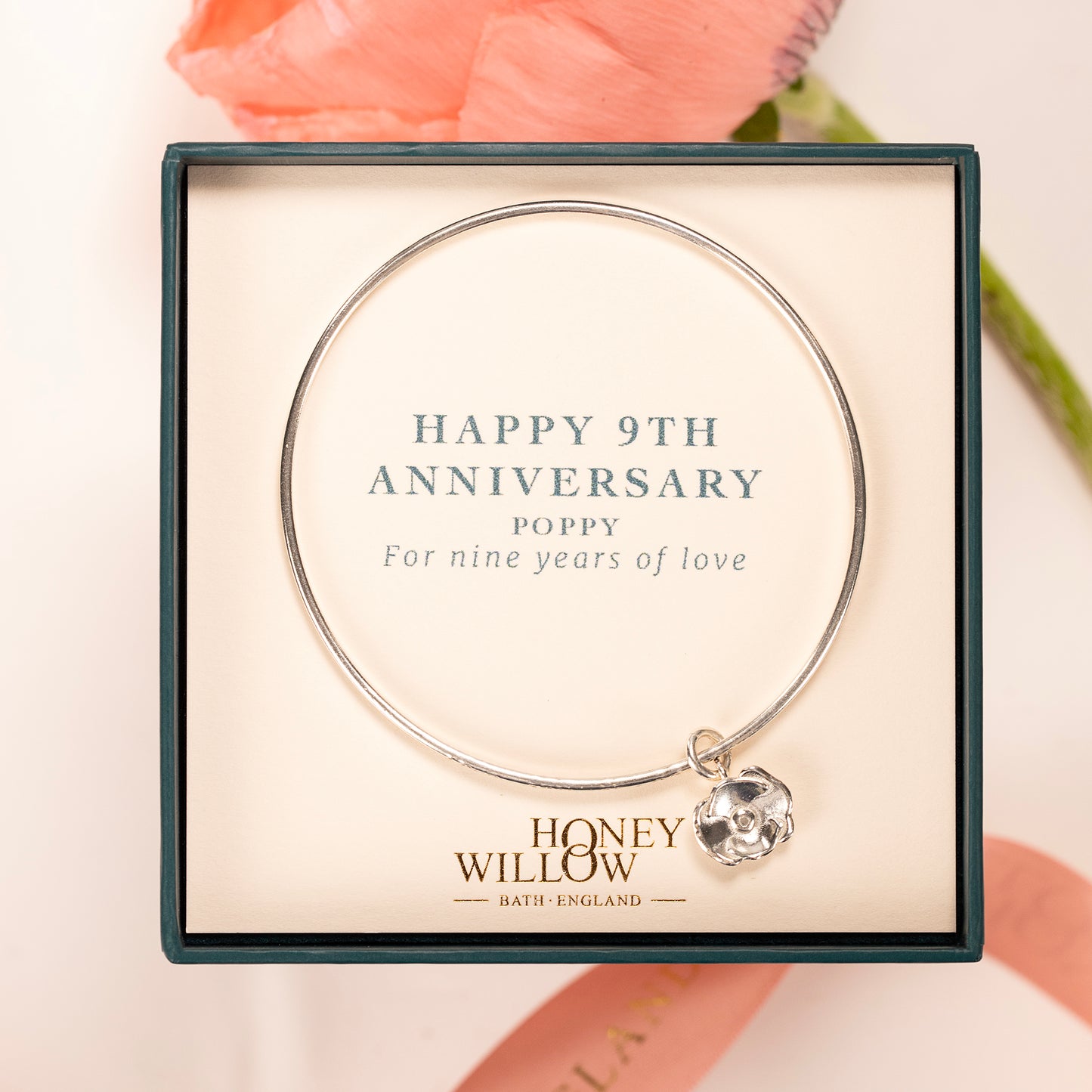 9th Anniversary Gift - Personalised Poppy Flower Bangle - Silver