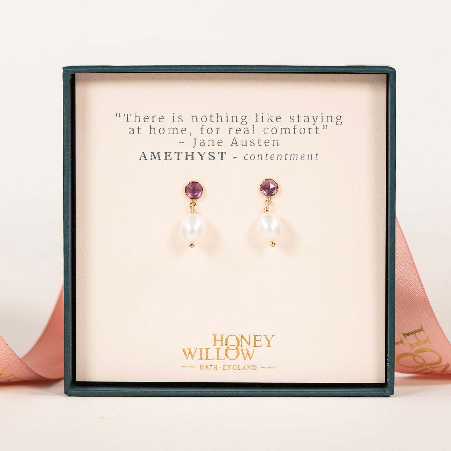 These amethyst and freshwater pearls earrings come with a quote by Jane Austen.