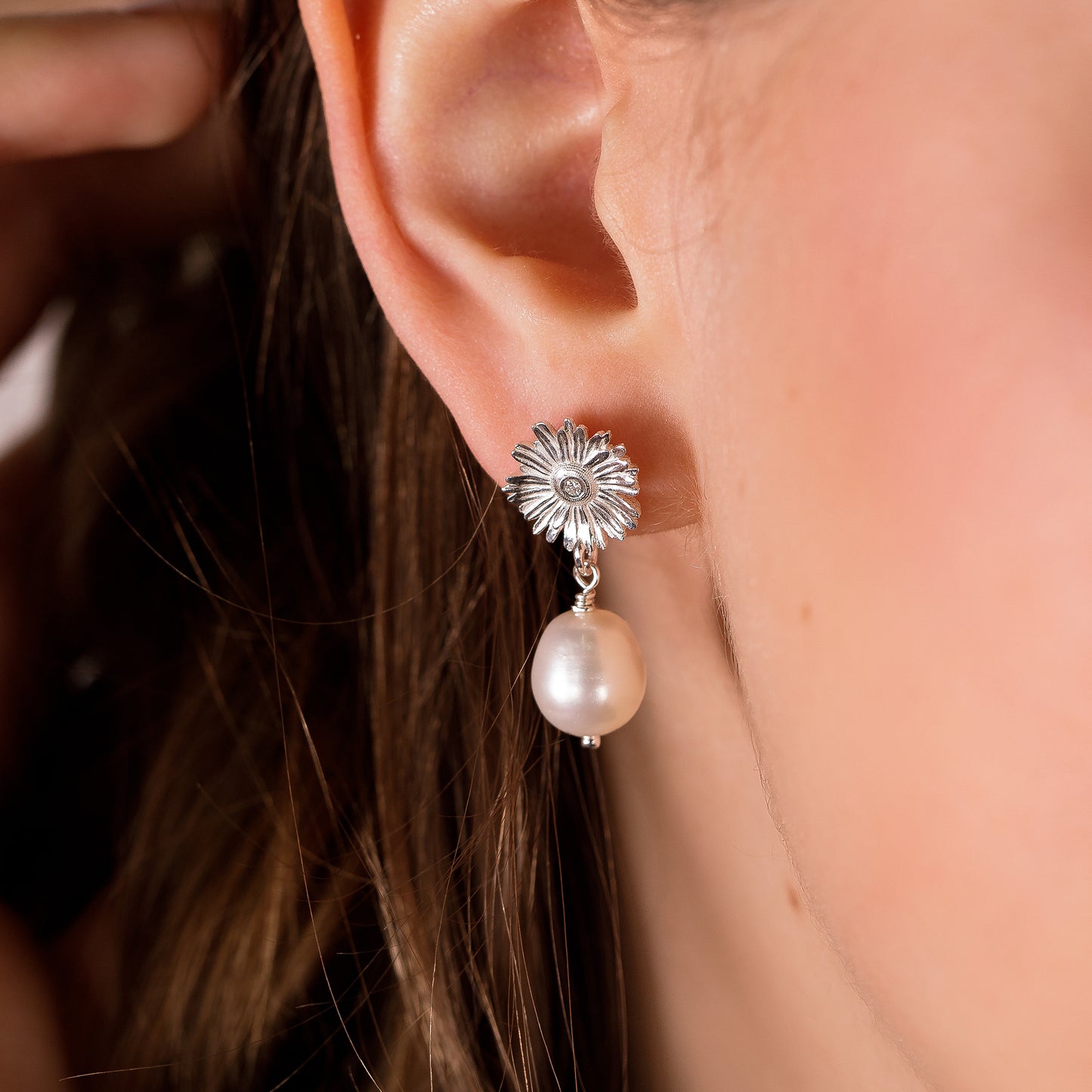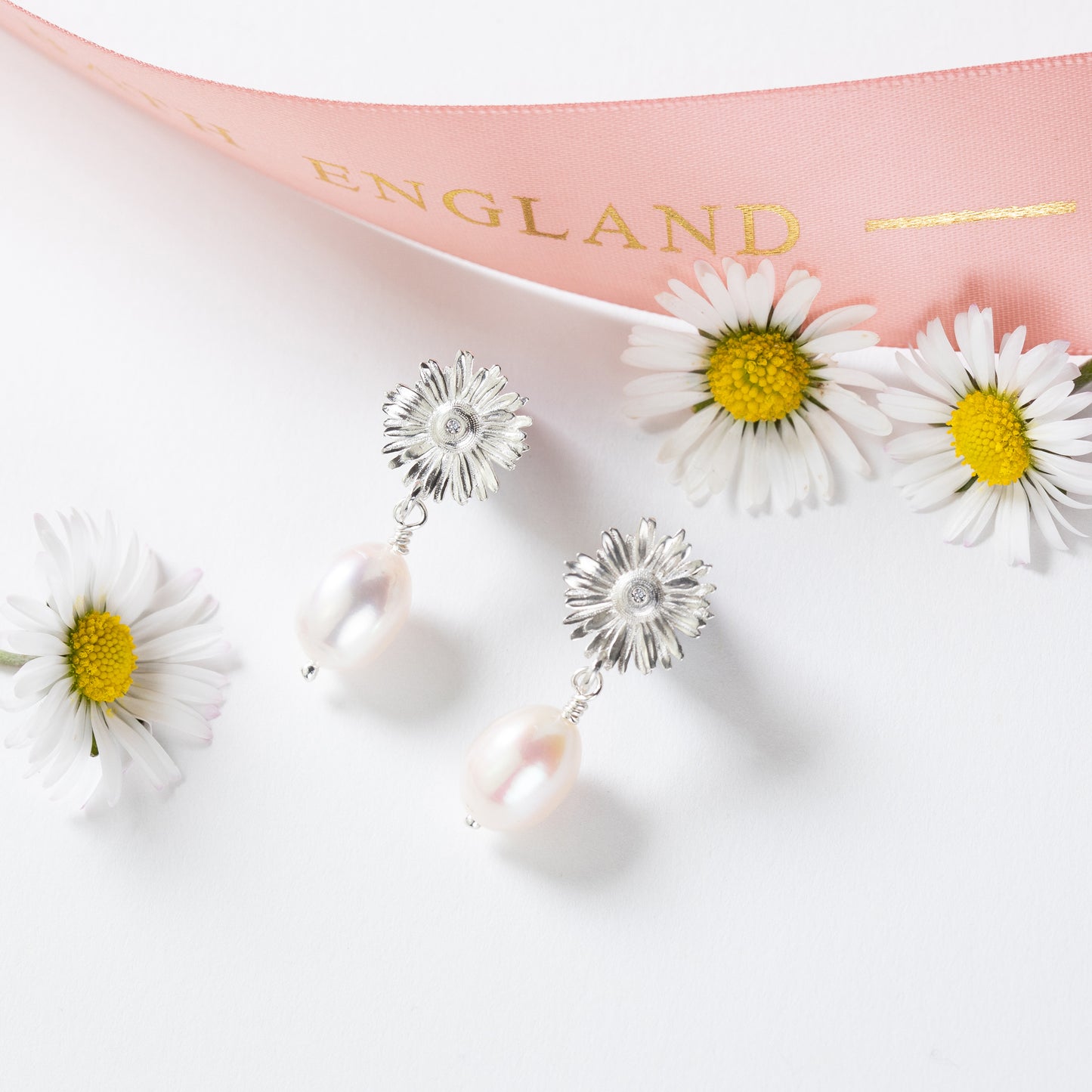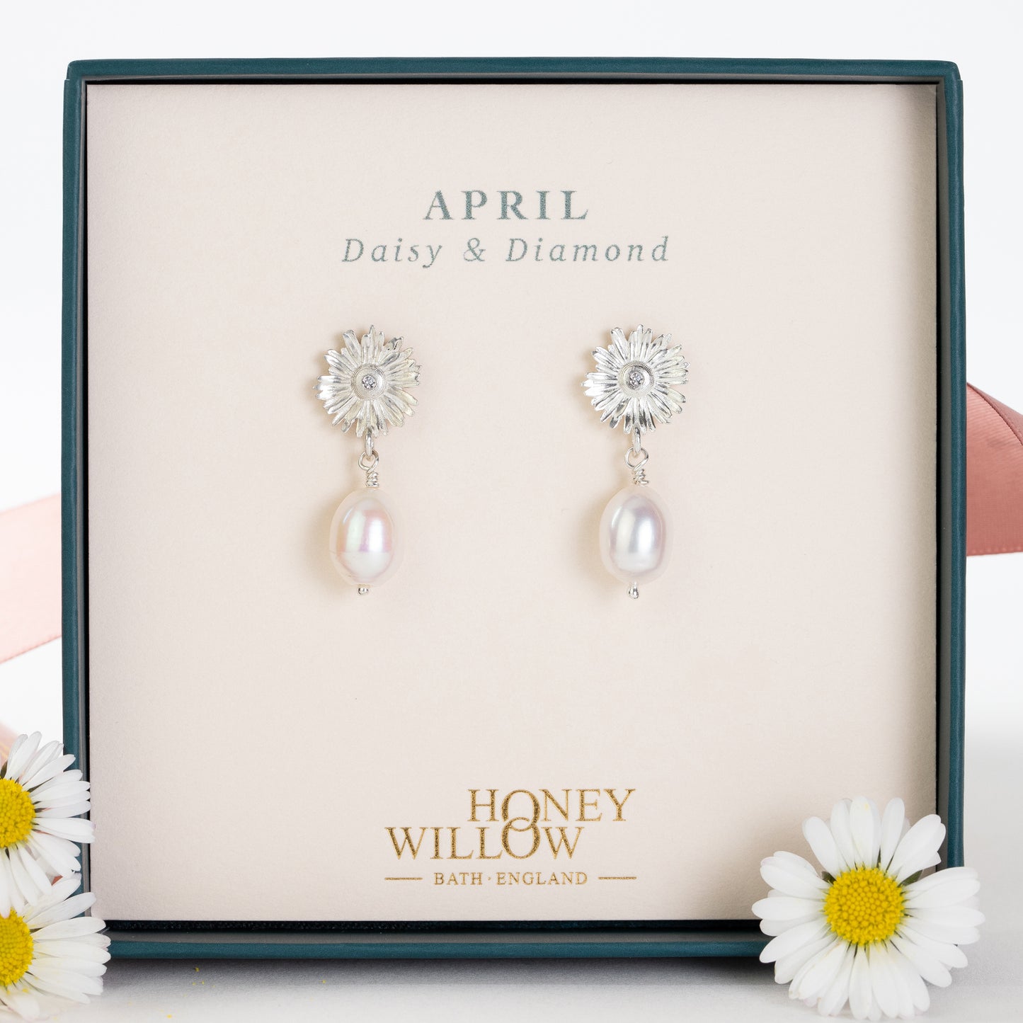 April Birth Flower & Birthstone Earrings - Daisy & Lab Grown Diamond - Silver & Pearl