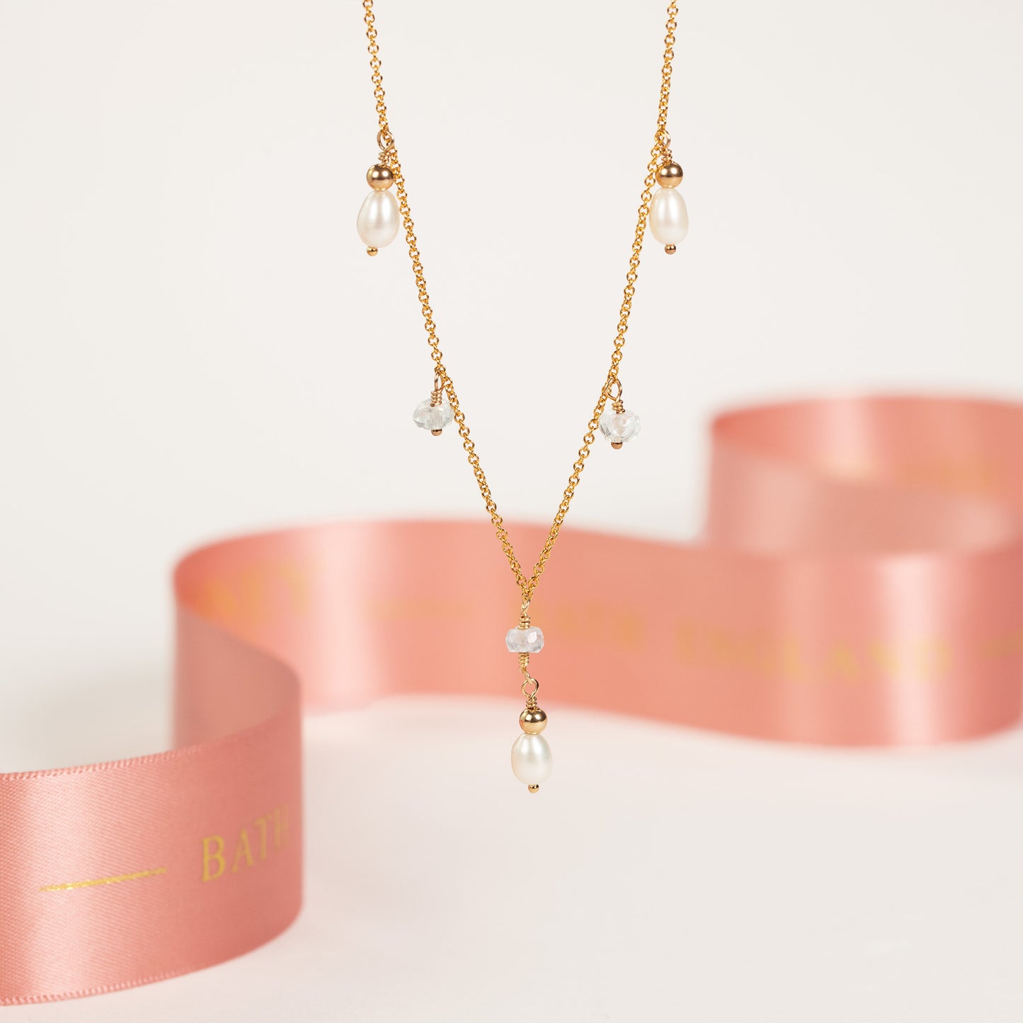 This dainty aquamarine and pearl drop necklace is inspired by the character Daphne from Bridgerton.