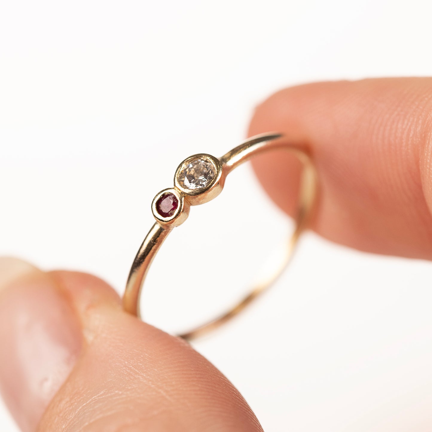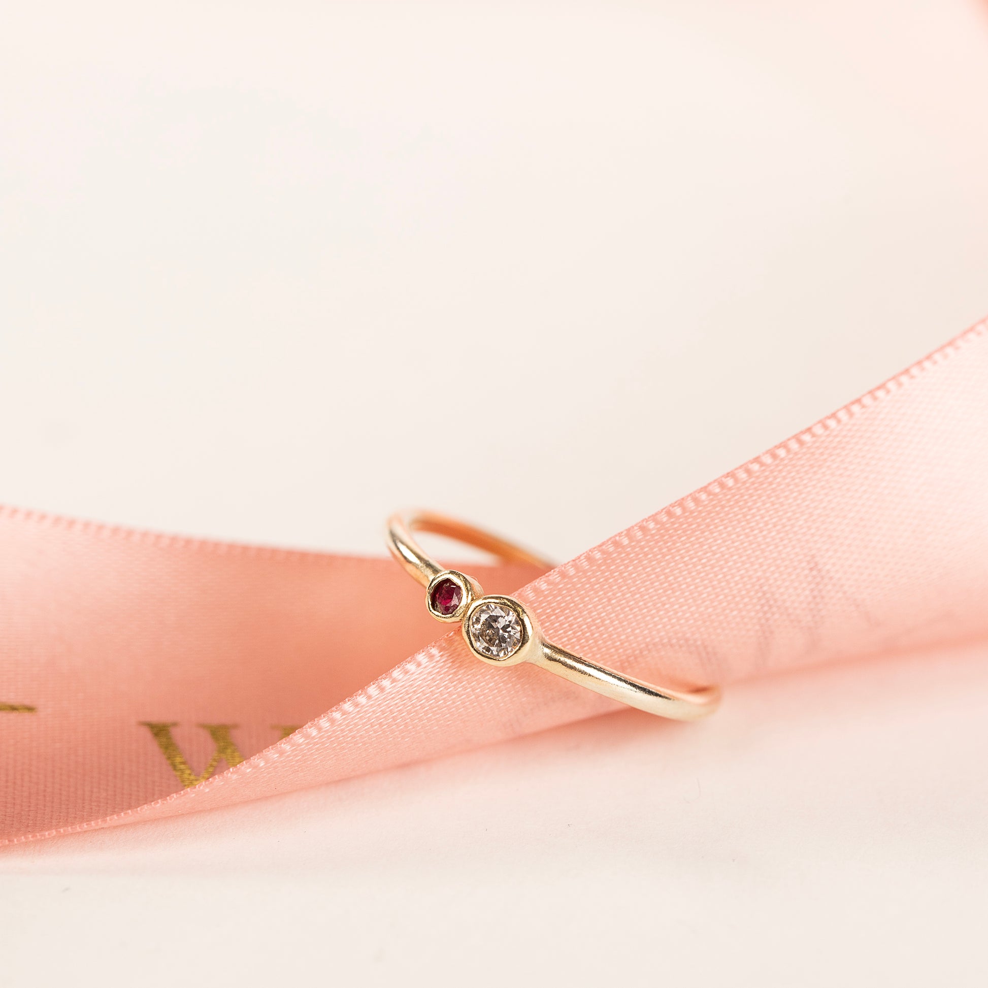 This dainty 9kt gold ring is handmade with a lab-grown diamond as the larger stone, with the birthstone of your choice beside it.