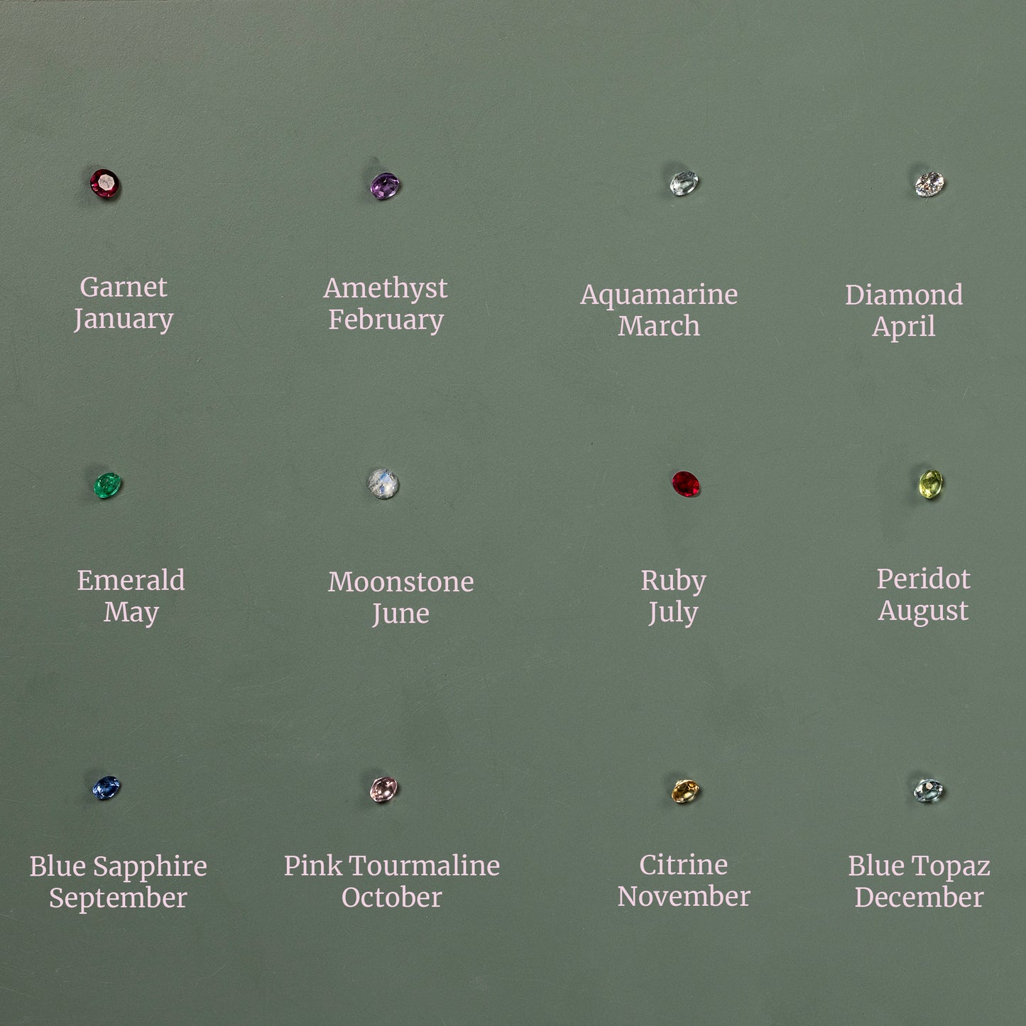 Image 2 shows the birthstones we use. Please note that the diamonds are lab-grown. A lab-grown diamond is made from the same material as a mined diamond, without the ethical and environmental problems.