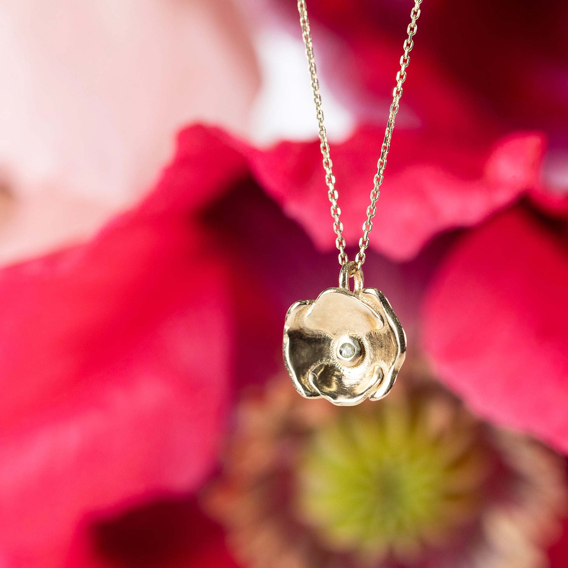 Celebrate her birth month with a unique poppy necklace, made with recycled 9kt gold and set with a tiny peridot.