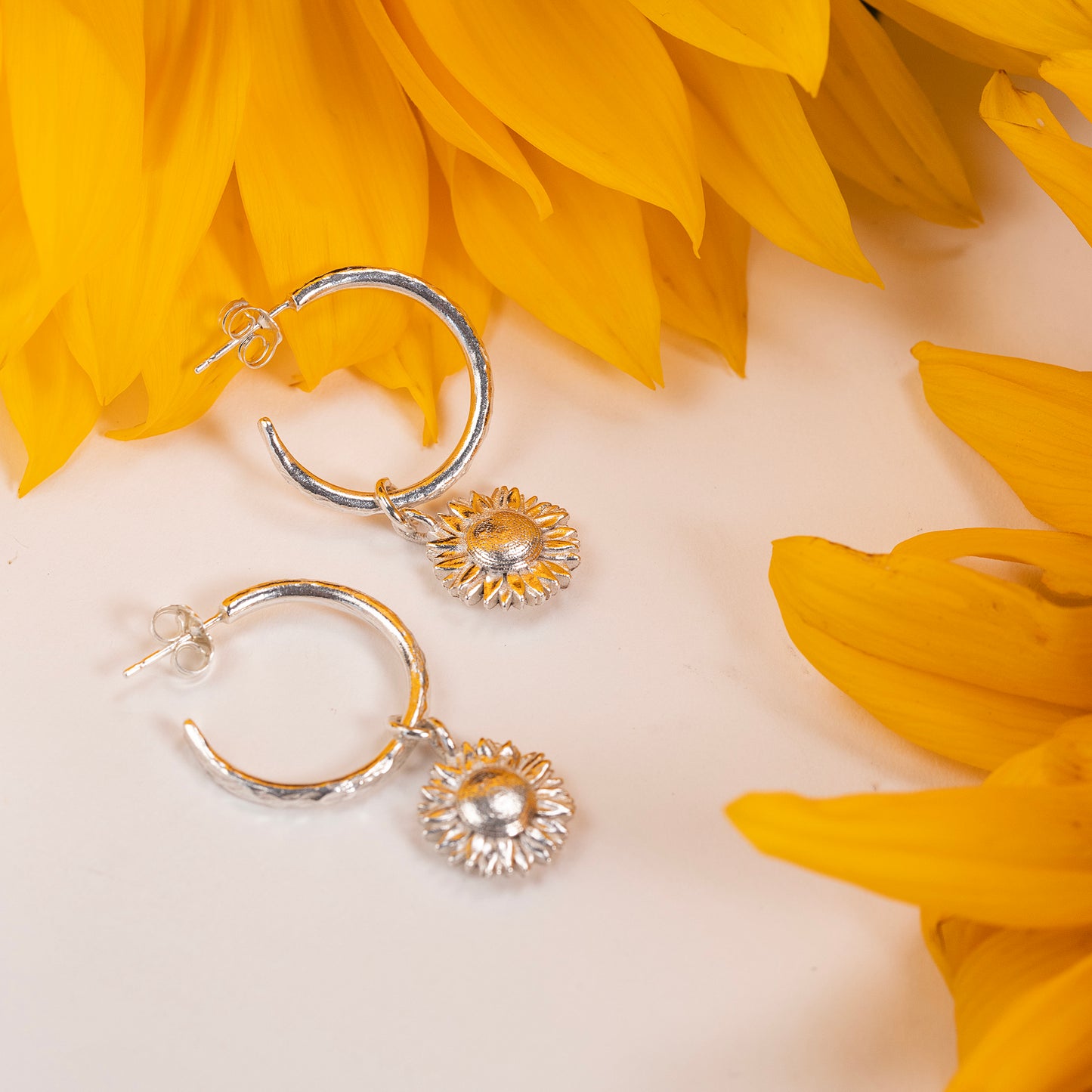 August Birth Flower Hoop Earrings - Sunflower - Silver - 2cm