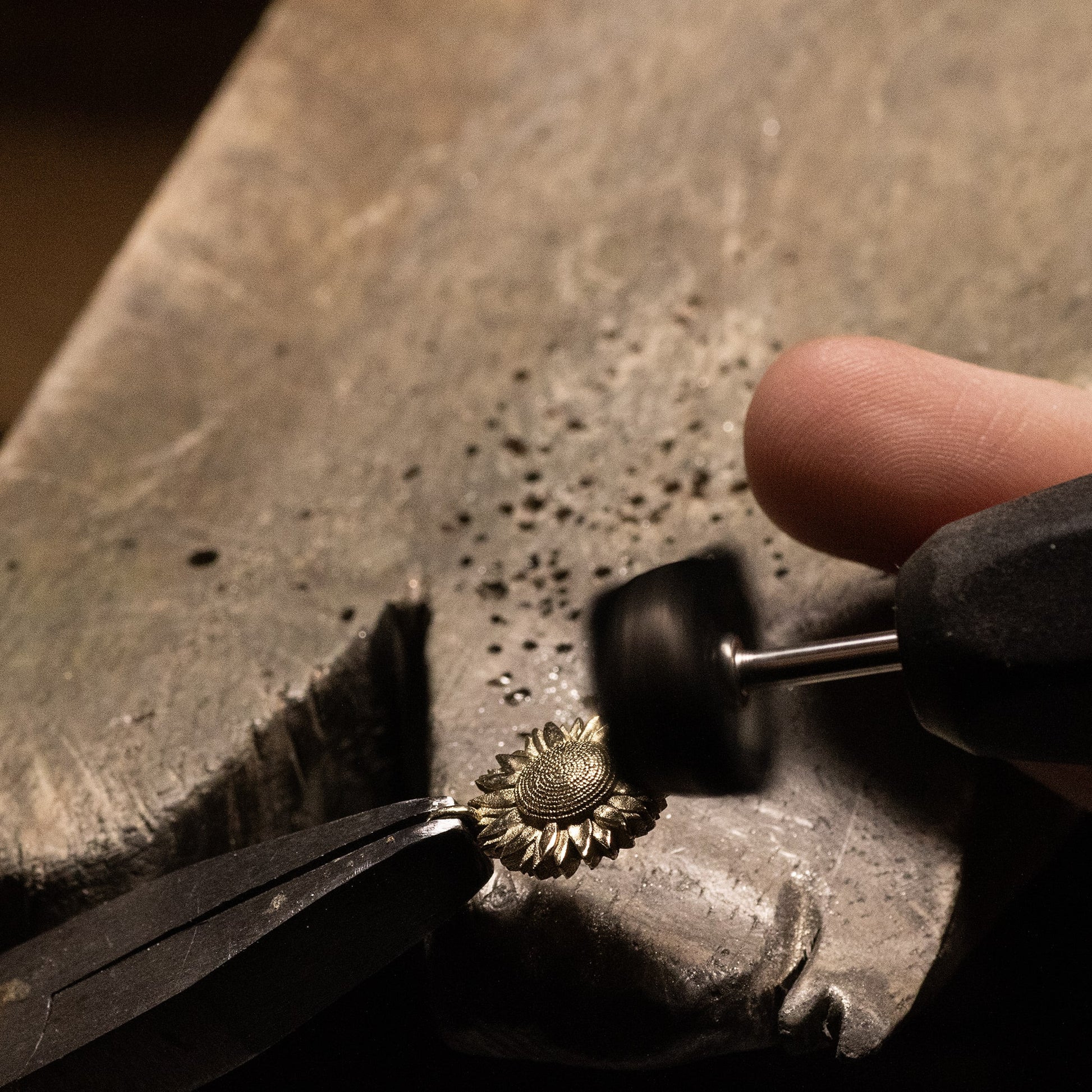 The sunflower pendant is 1cm in diameter. It is hallmarked as 9kt gold.