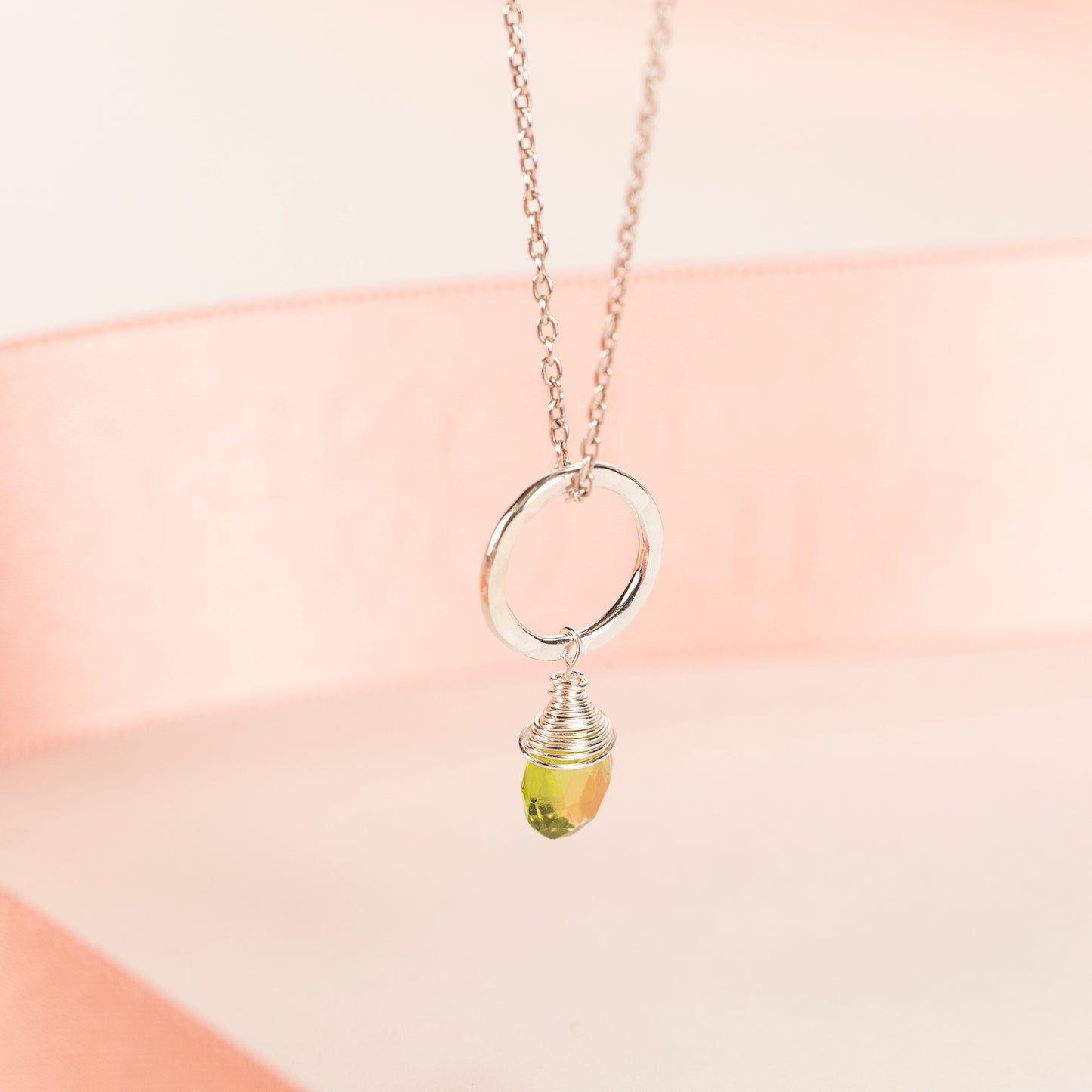 Peridot is a birthstone for August. Circles symbolise infinite love, strength, protection and inclusivity.