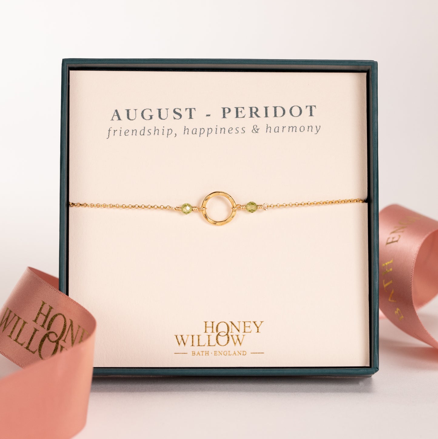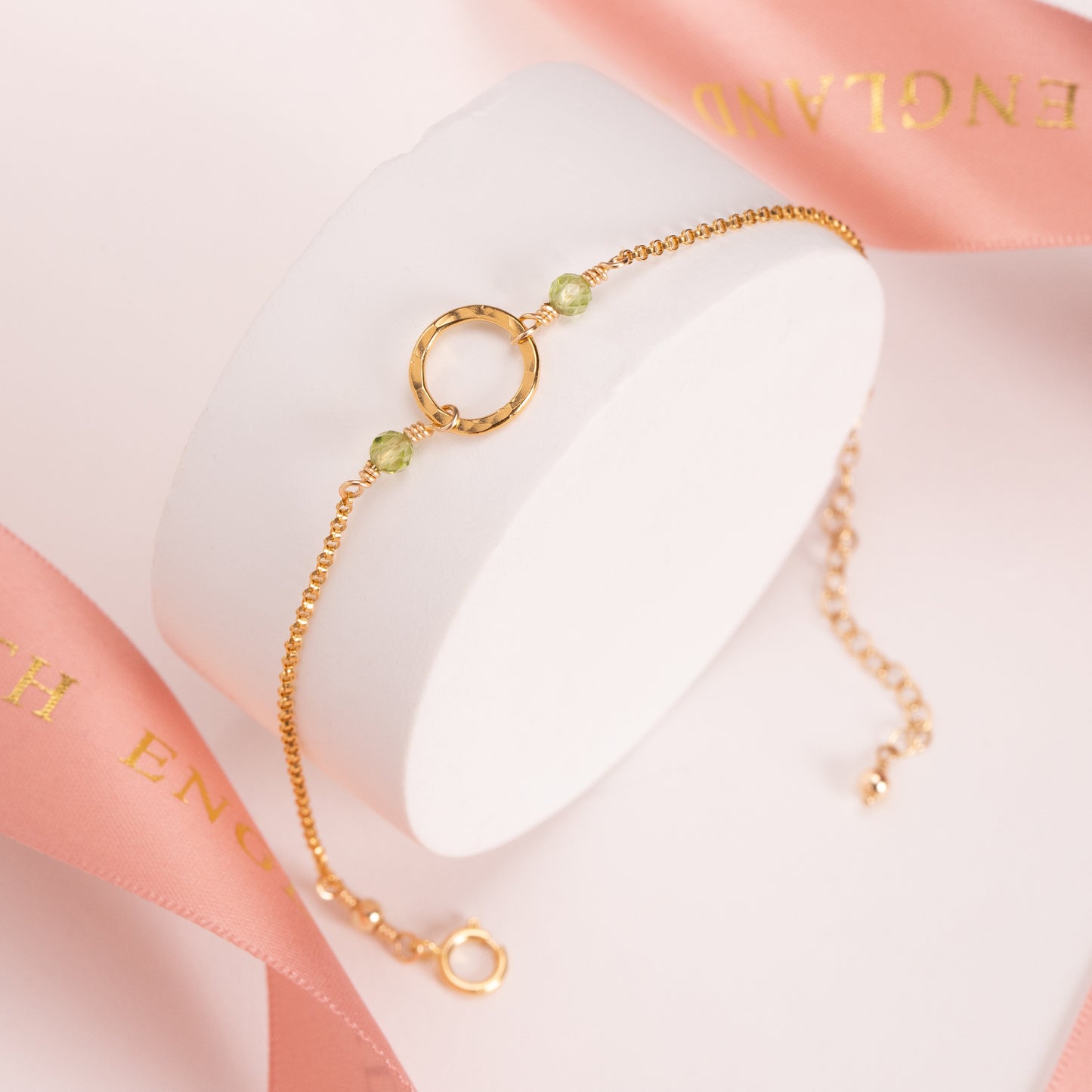 Celebrate her August birthday with a delicate bracelet handmade with her birthstones on either side of a circle.